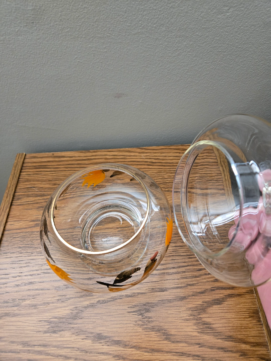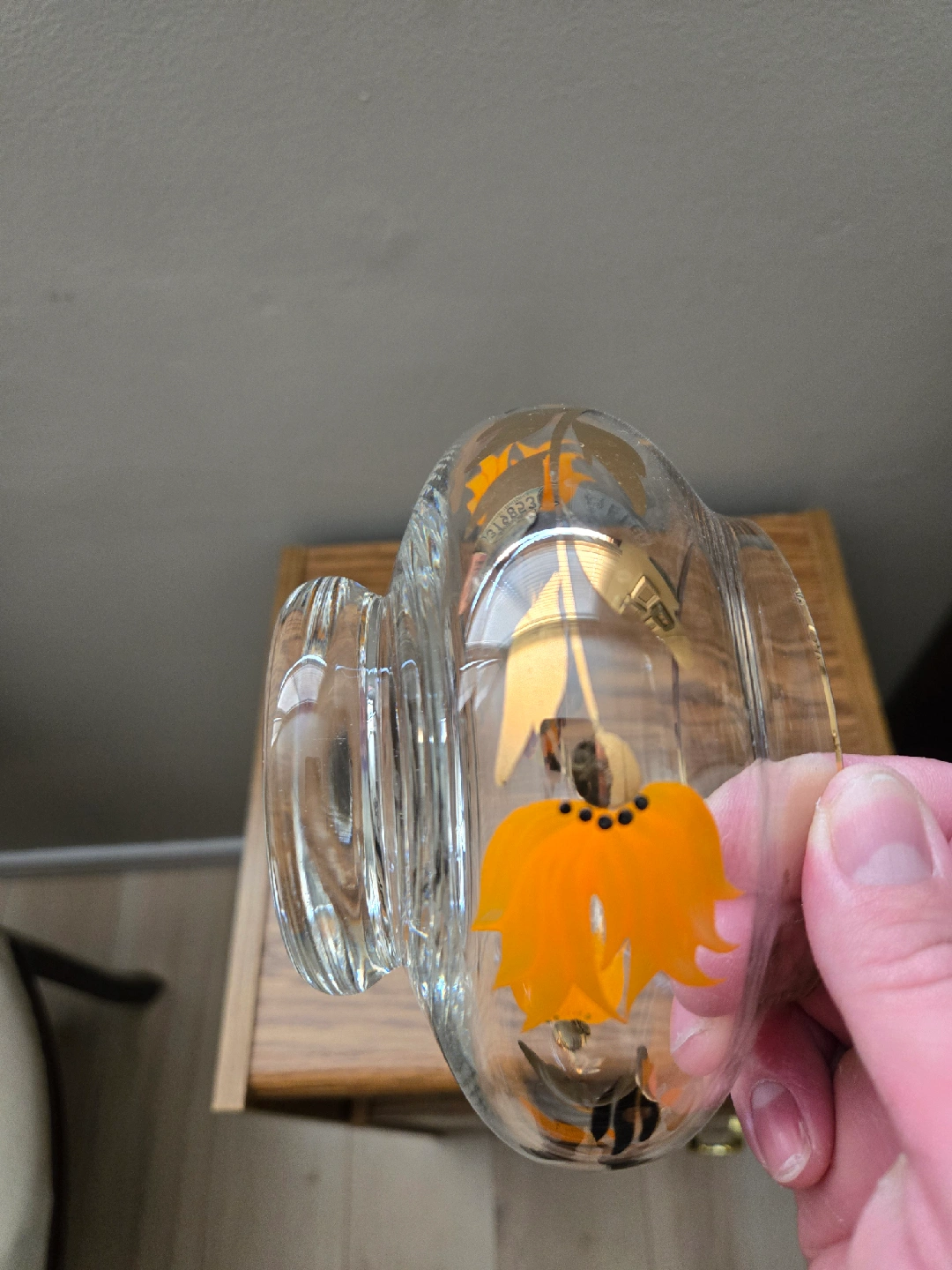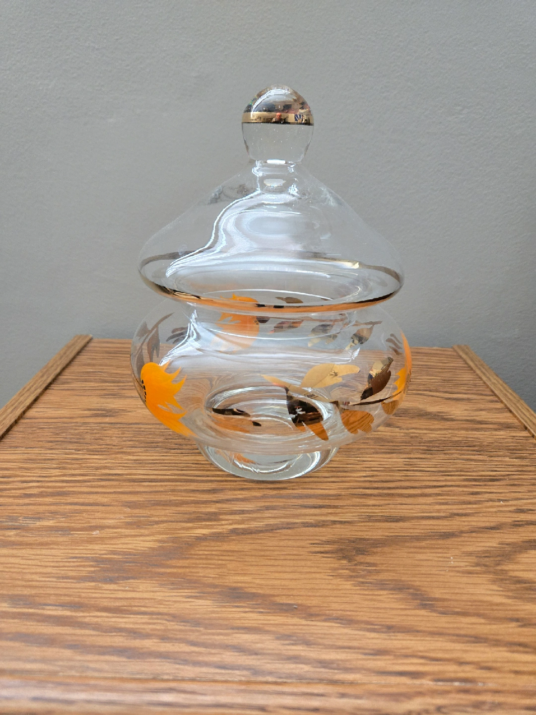 Selling a cute glass candy dish with a lid. It has a gold trim and a pretty orange floral design. Perfect for adding a touch of vintage charm to your home! Pickup in Castle Downs