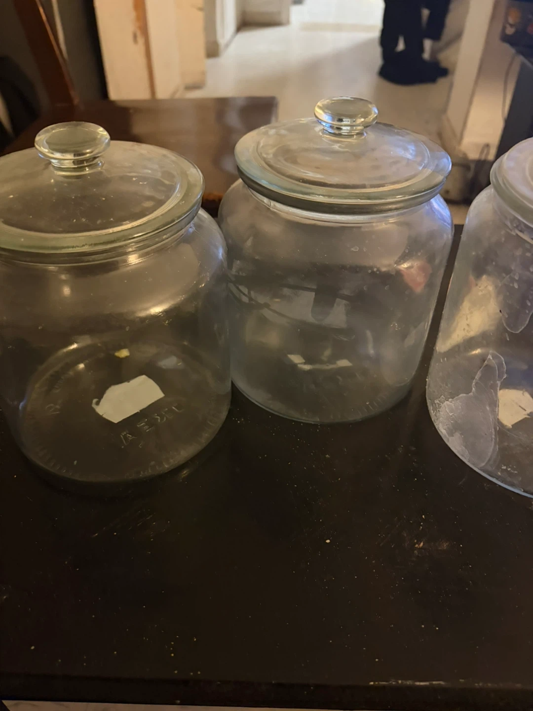9Selling these glass canisters with lids. They are perfect for storing dry goods or other items around the house. They show some signs of use, but are still in good condition for their age