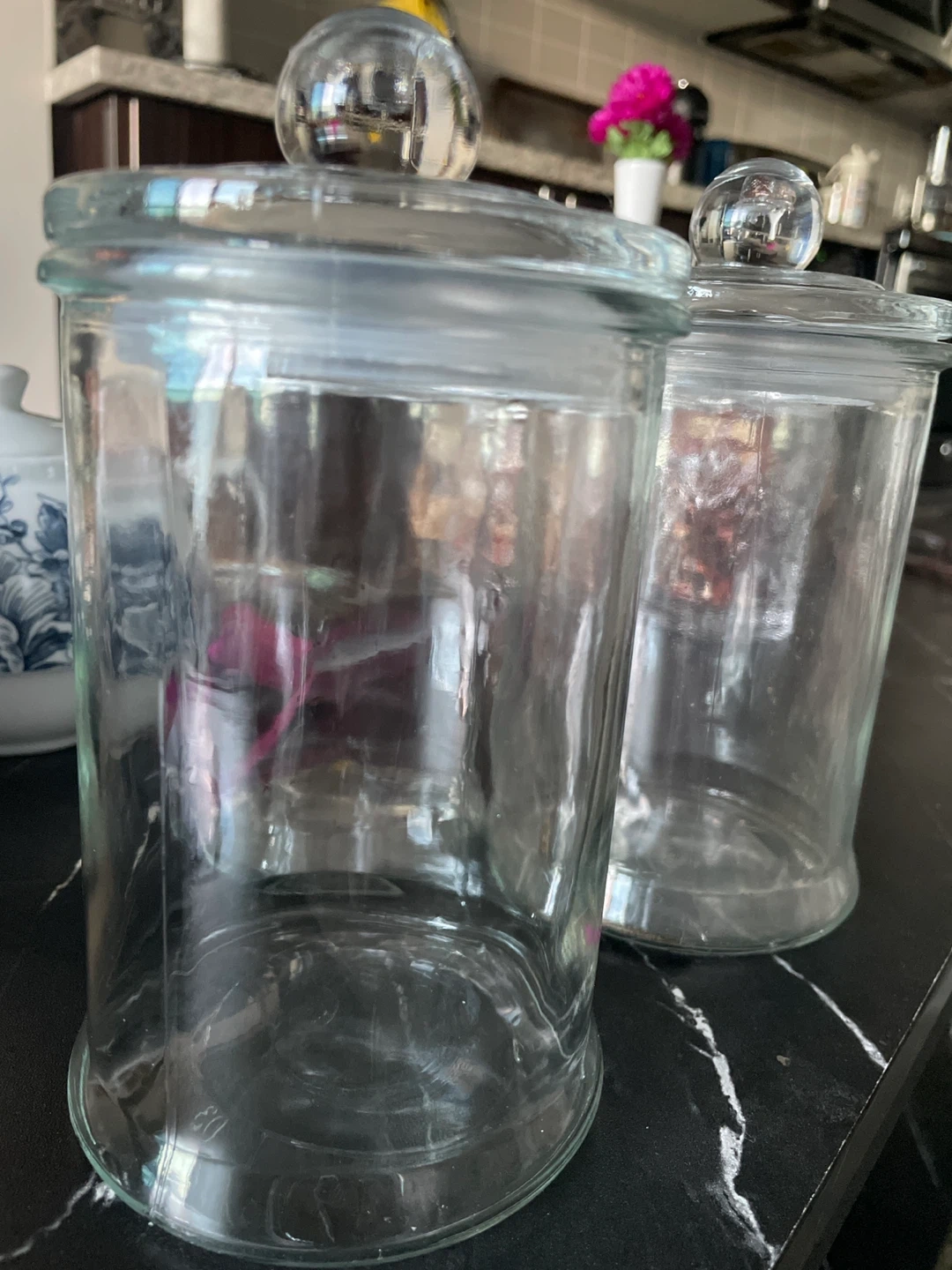 Selling a set of three glass canisters, each with a lid and a decorative glass knob on top. They're perfect for storing dry goods in the kitchen or for organizing items around the house. They're in great condition and ready for a new home. New!