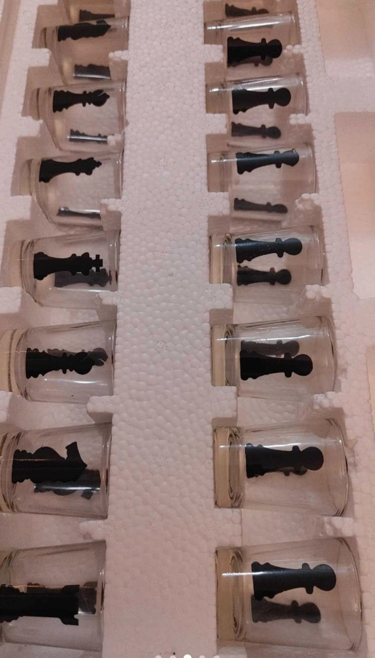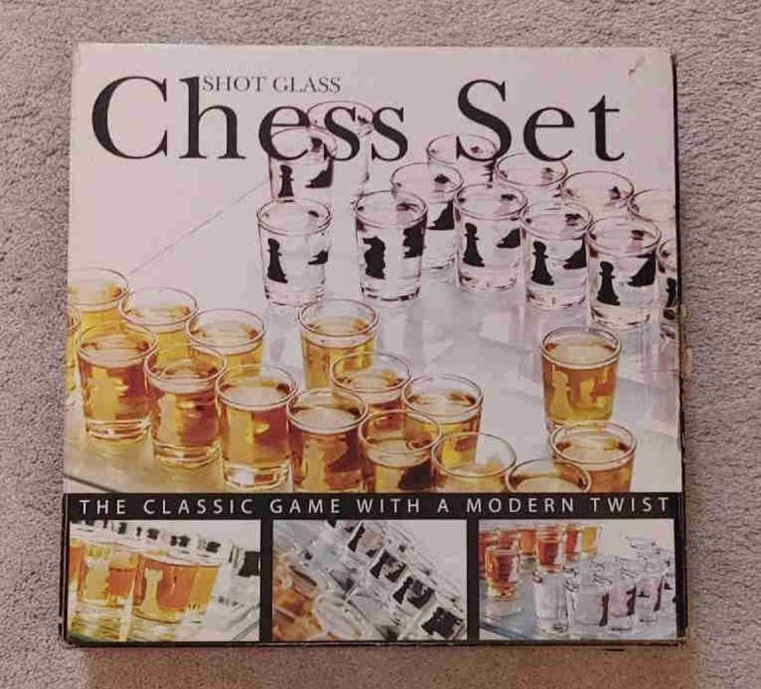 96Glass Chess Set The perfect drinking game! Keep your mind sharp with you drink and try to beat your opponent! -All glass peices inclued and glass board -In perfect condition - never used for drinking, just on display -In original box Avaliable for pick up.