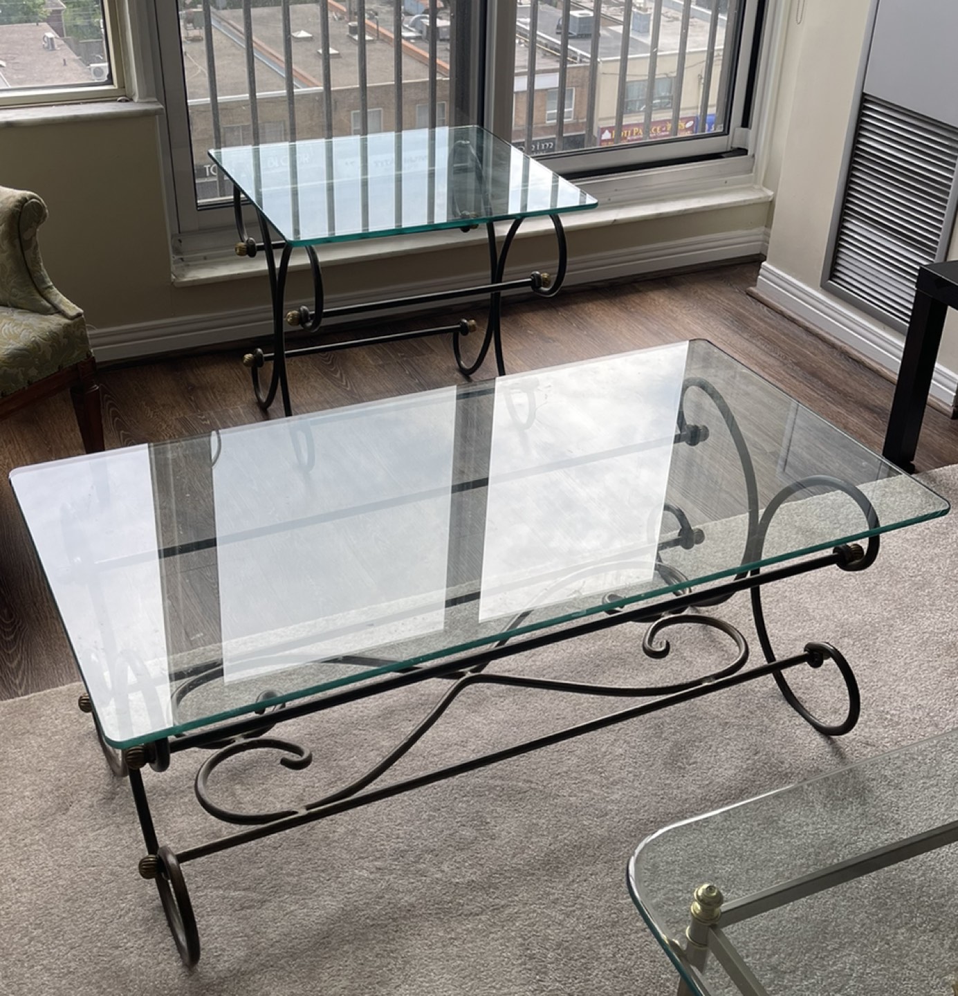 10Elegant Bronze coffee table and end table with gold feature; glass top