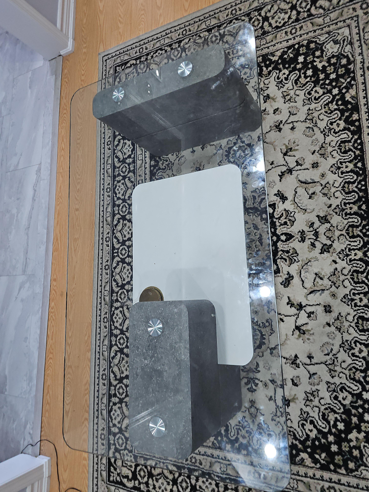 Selling a stylish coffee table with a glass top and unique stone-like accents. It features a white rectangular middle section and a clear glass top. The stone-look supports add a modern touch to any living space