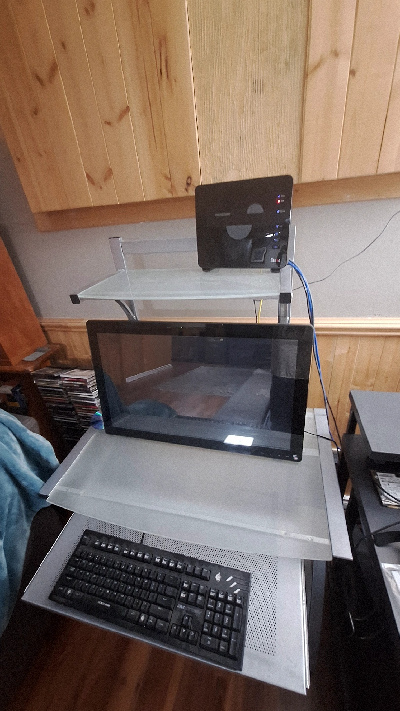 68Selling a glass computer desk.. It's in good condition and perfect for a home office. The desk has a sleek design with one shelve.