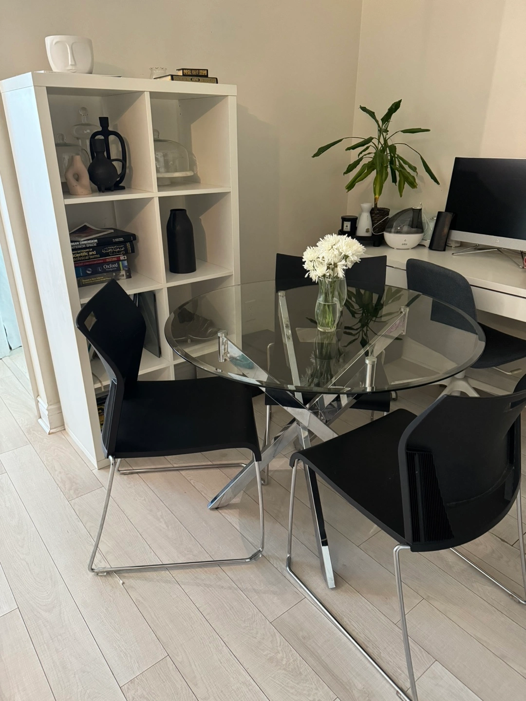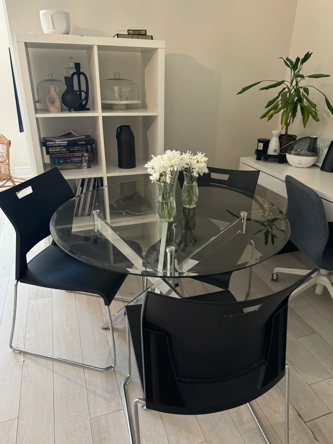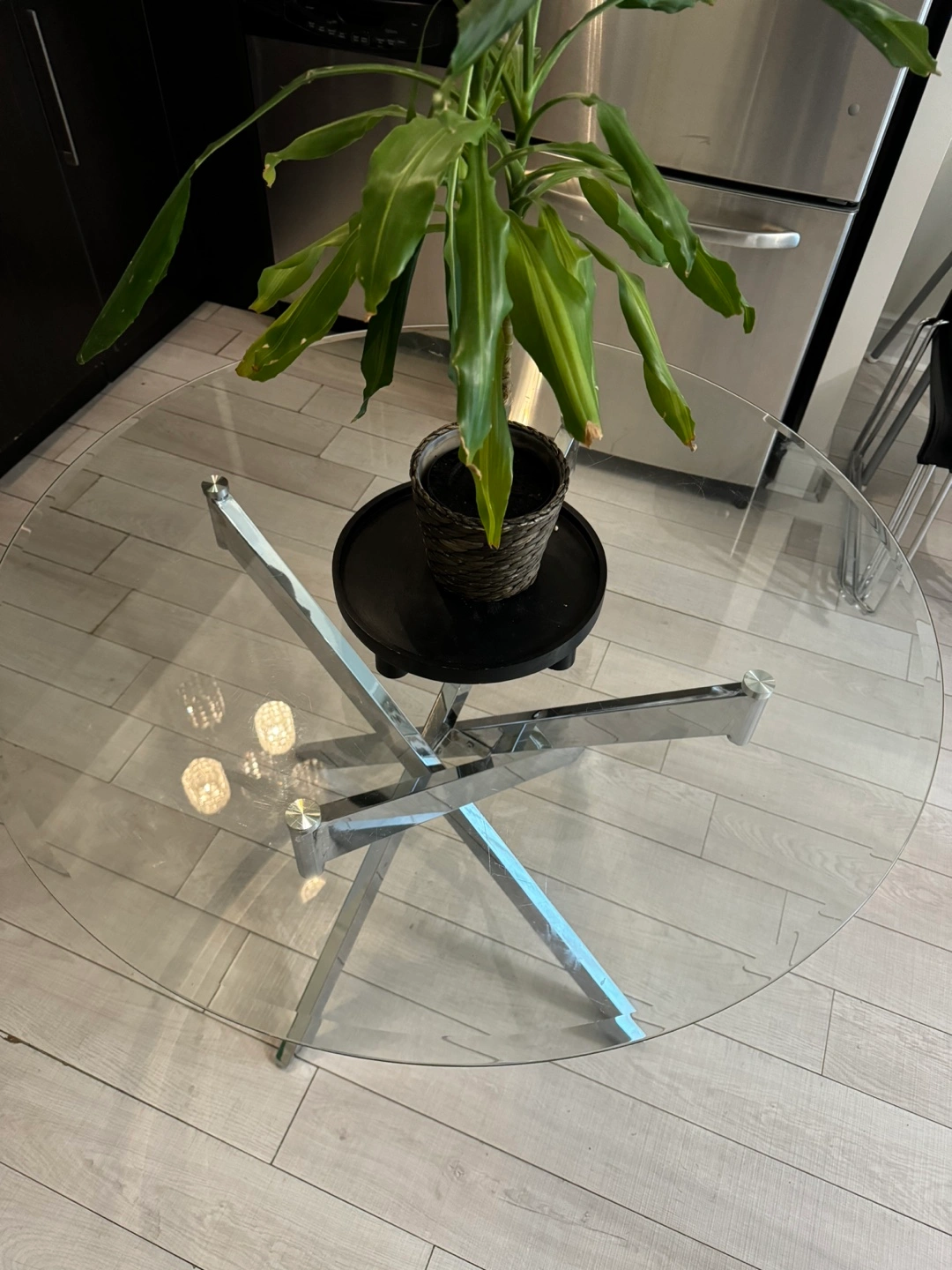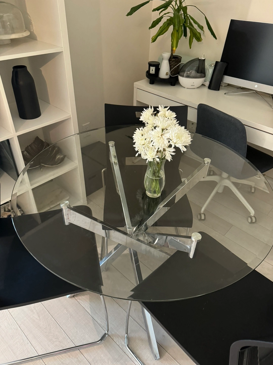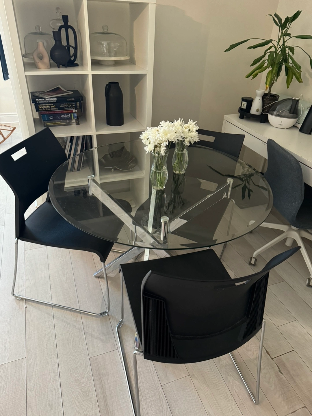 10Round glass table with chrome legs and 4 black chairs. Great for a small dining room or kitchen. The glass top has some scratches but the chairs are almost brand new Diameter: 100cm Urgent pick up, I’m moving. Pick up at 16 Brookers Lane.
