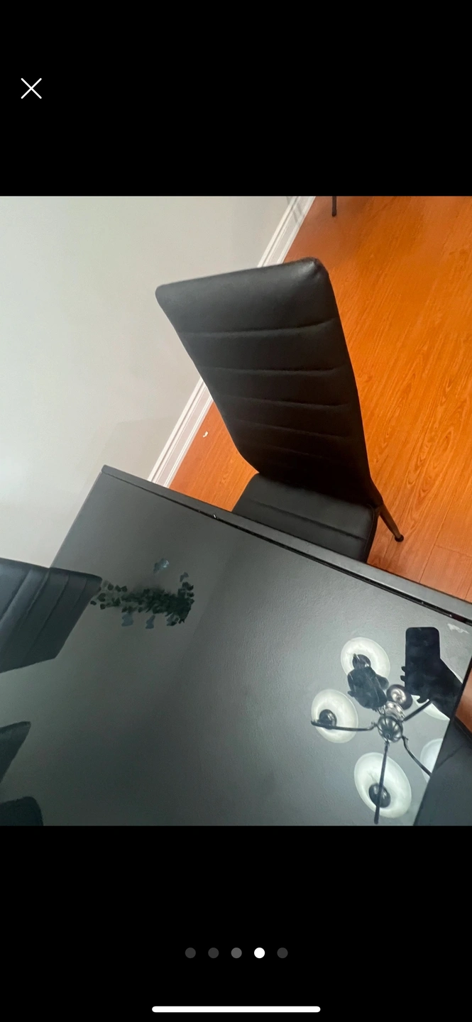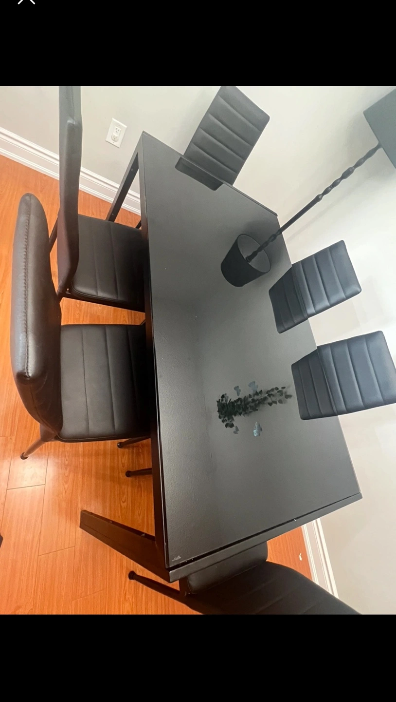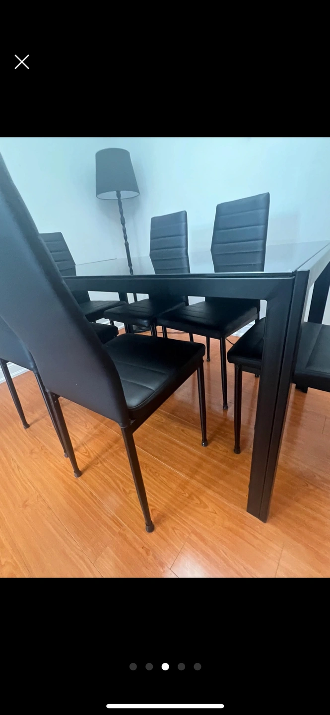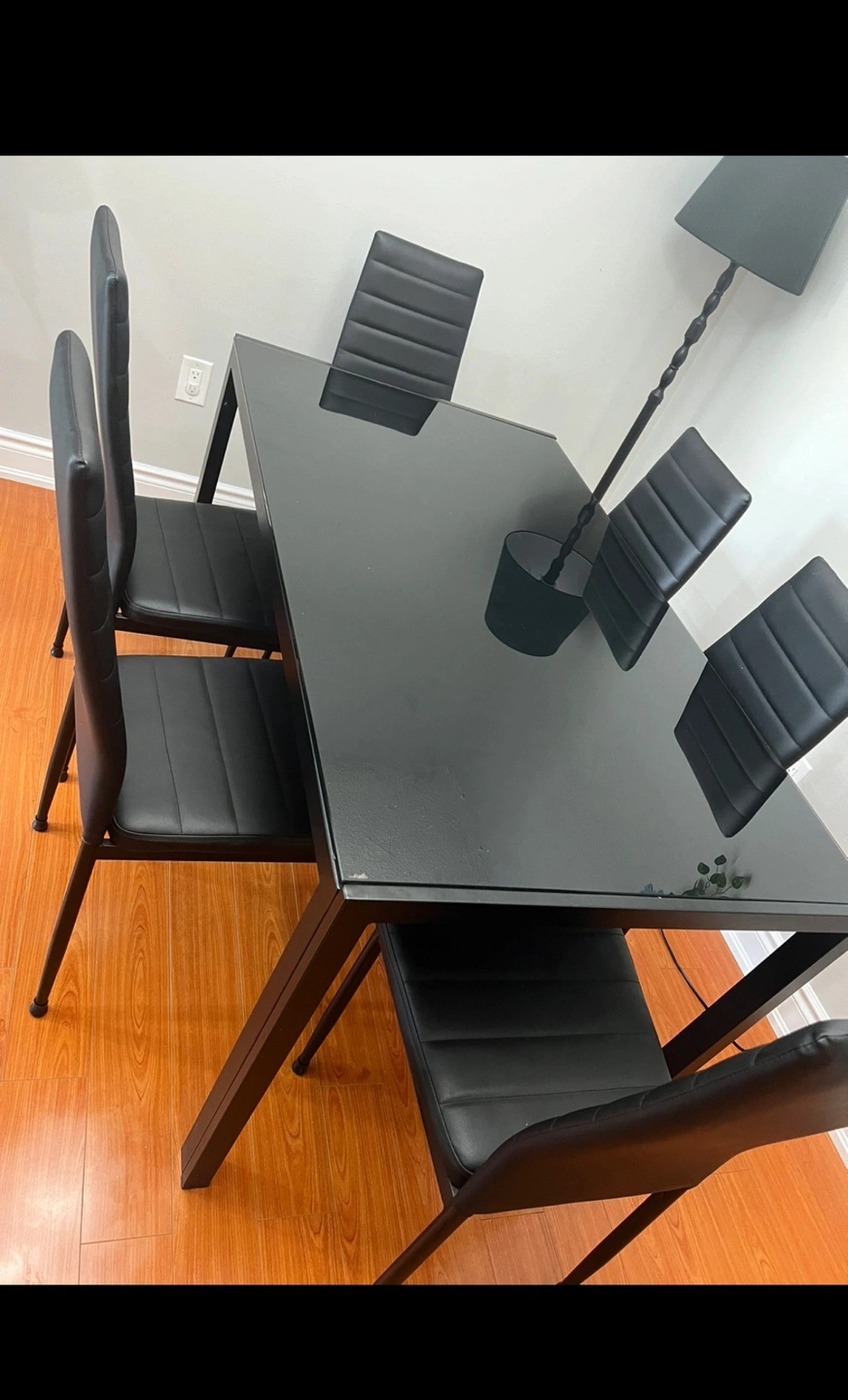 Black glass table with 6 black faux leather chairs. The table and chairs are in great condition just like new moving sale