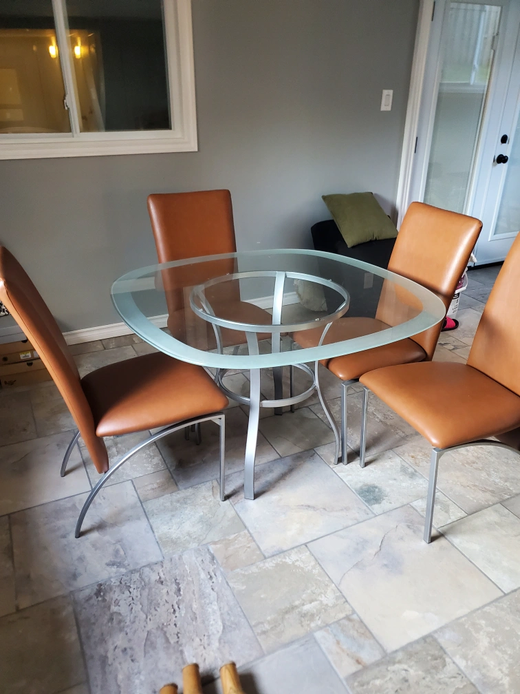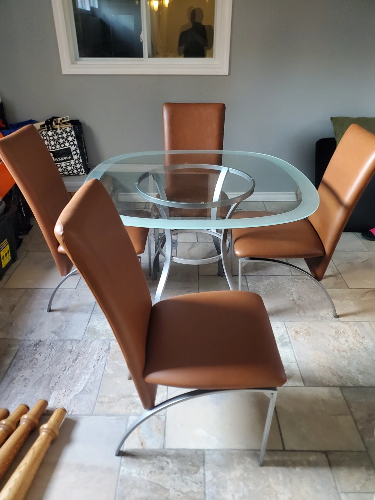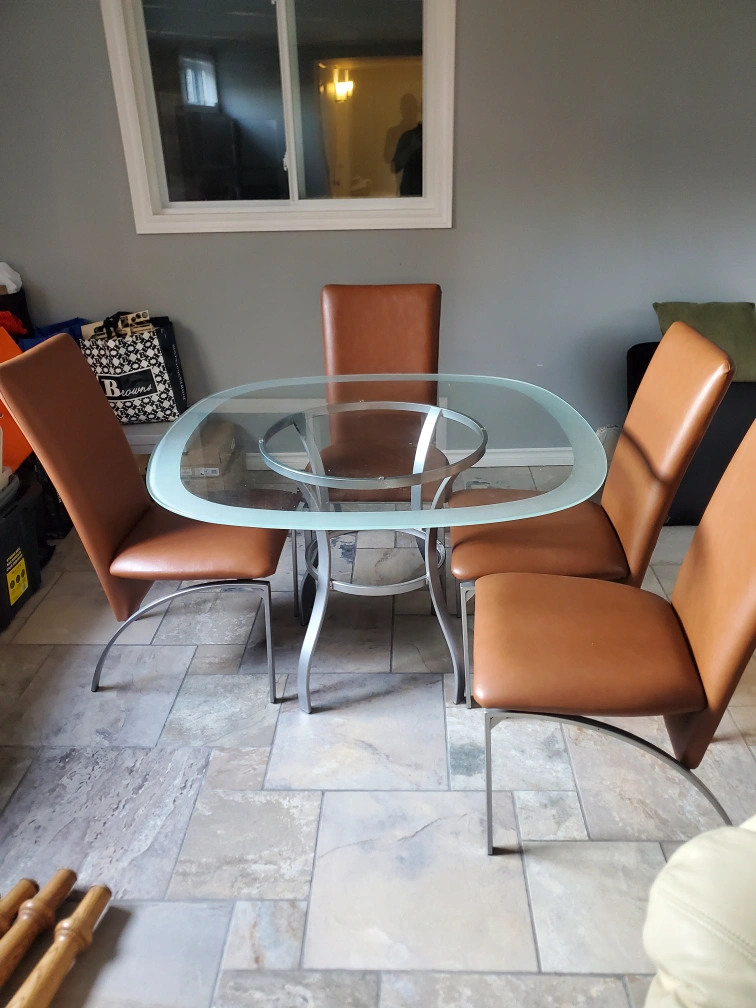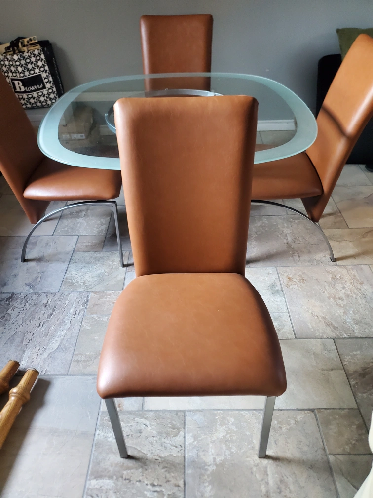 Selling a stylish glass dining table set that comes with four chairs. The chairs are upholstered in a warm, brown leather-like material and have sleek, silver-tone legs. The table features a unique, rounded glass top and a modern, silver-tone base. Perfect for adding a touch of elegance to your dining space!