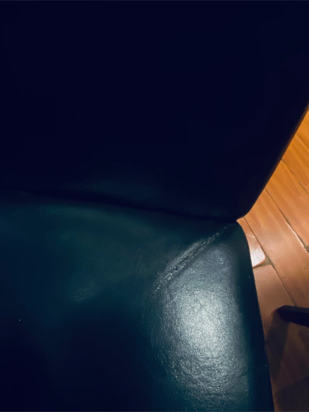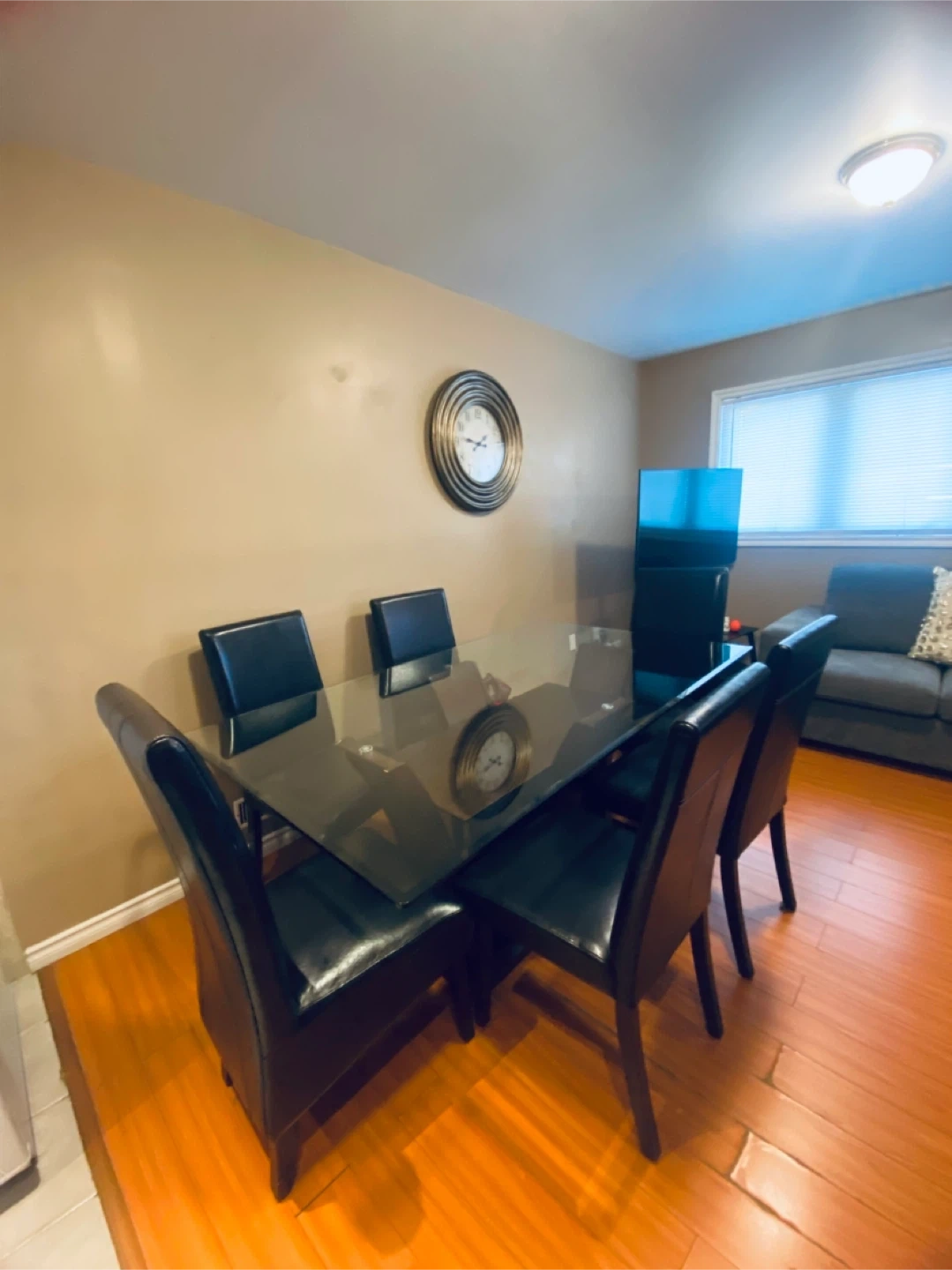 Selling a dining table set that includes a glass table and six black leather chairs. The set is in great condition and would be a great addition to any dining room. There is a small crack on one of the chairs. Asking for $500