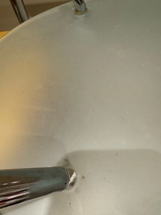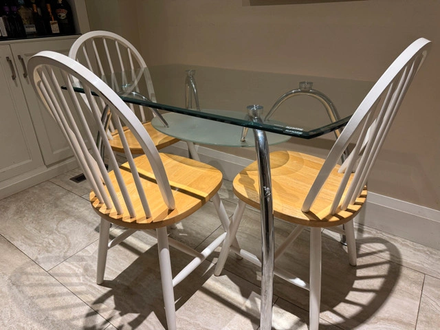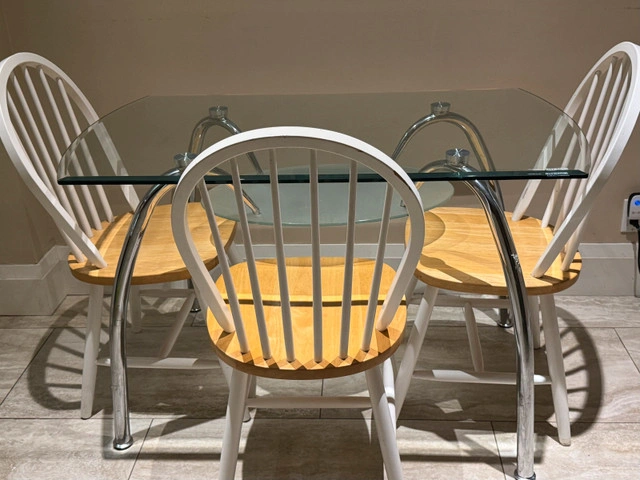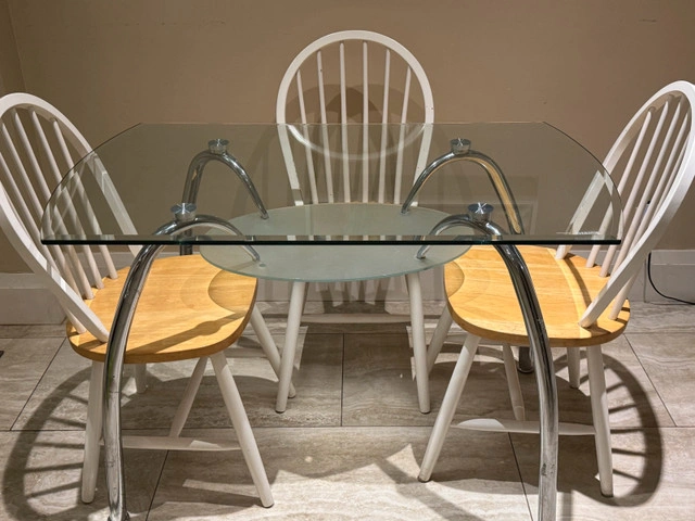 35Beautiful modern glass dining table with a sleek chrome base and built-in storage shelf — perfect for displaying magazines, flowers, or notes. A stylish and practical set that fits perfectly in any dining area or kitchen. All pieces show normal wear from use but still look great overall. Minor crack on one corner of the glass (barely visible!). One small silicone pad needed where the leg meets the glass Size (cm): 120 (L) * 70 (W) * 29.5 (D) Price: Table: $165 Chairs: $45 each Must be disassembled and carried by the buyer. Pickup near M4E 3C2 (Beaches area)
