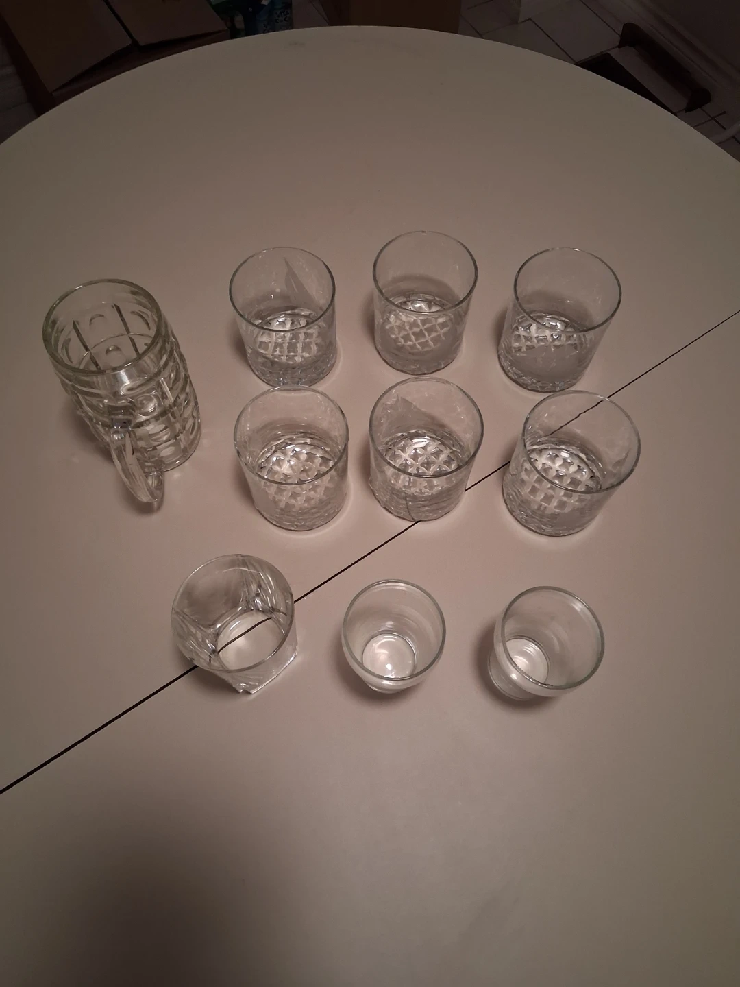 10Selling a set of clear glass drinkware. Includes a larger glass mug and several smaller glasses. Perfect for everyday use or entertaining!