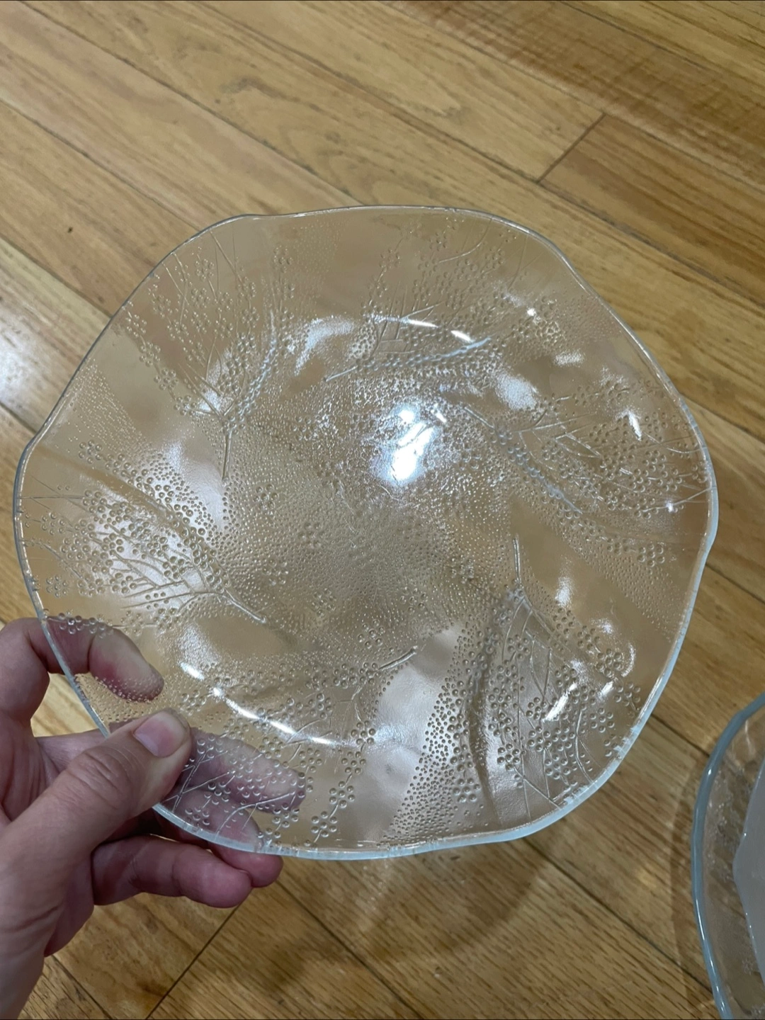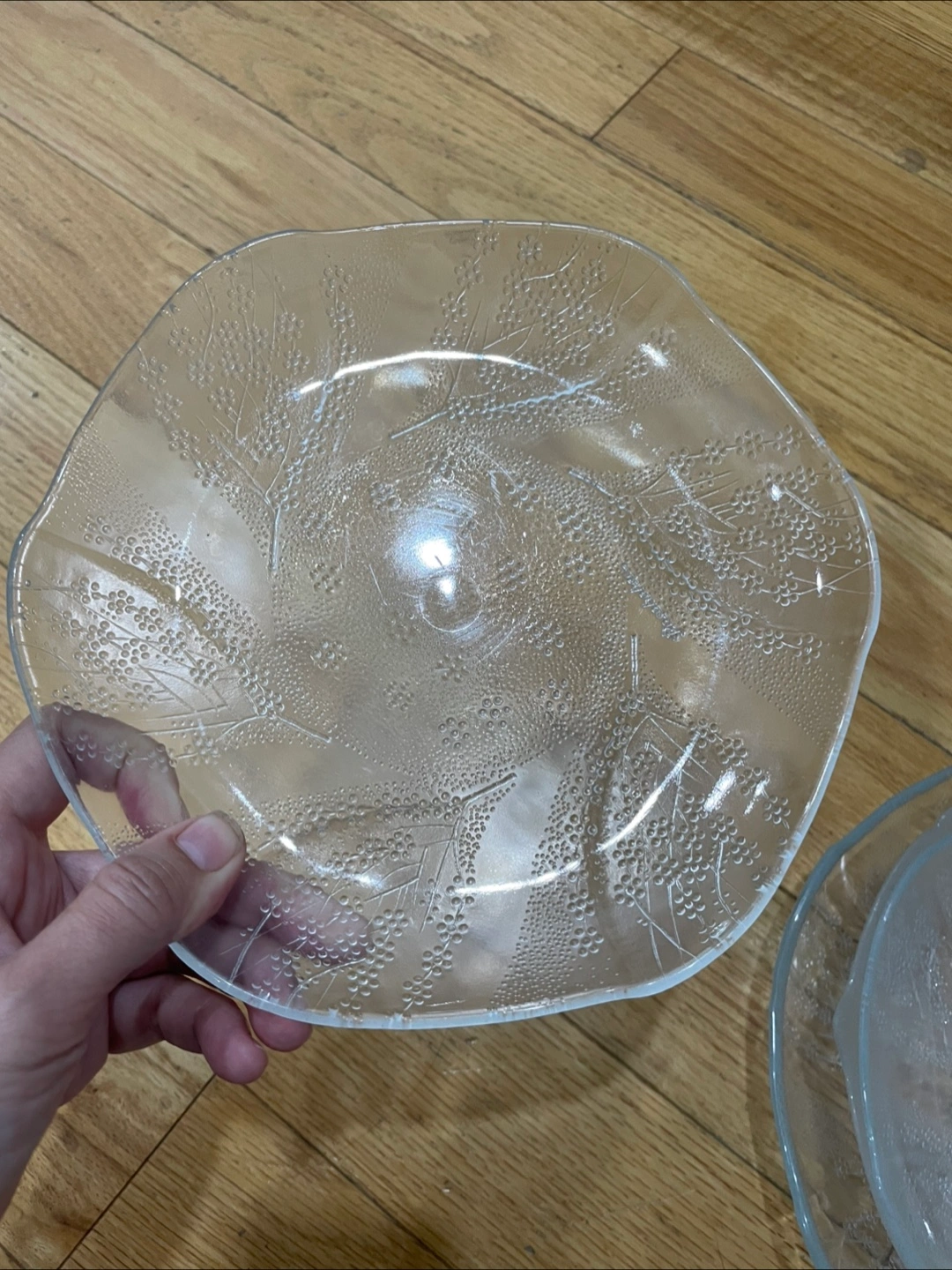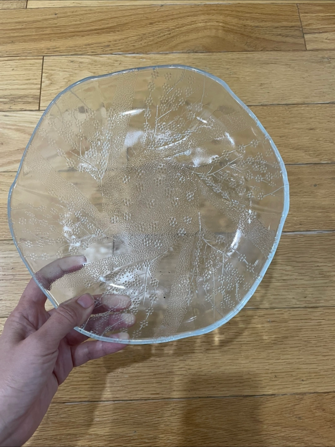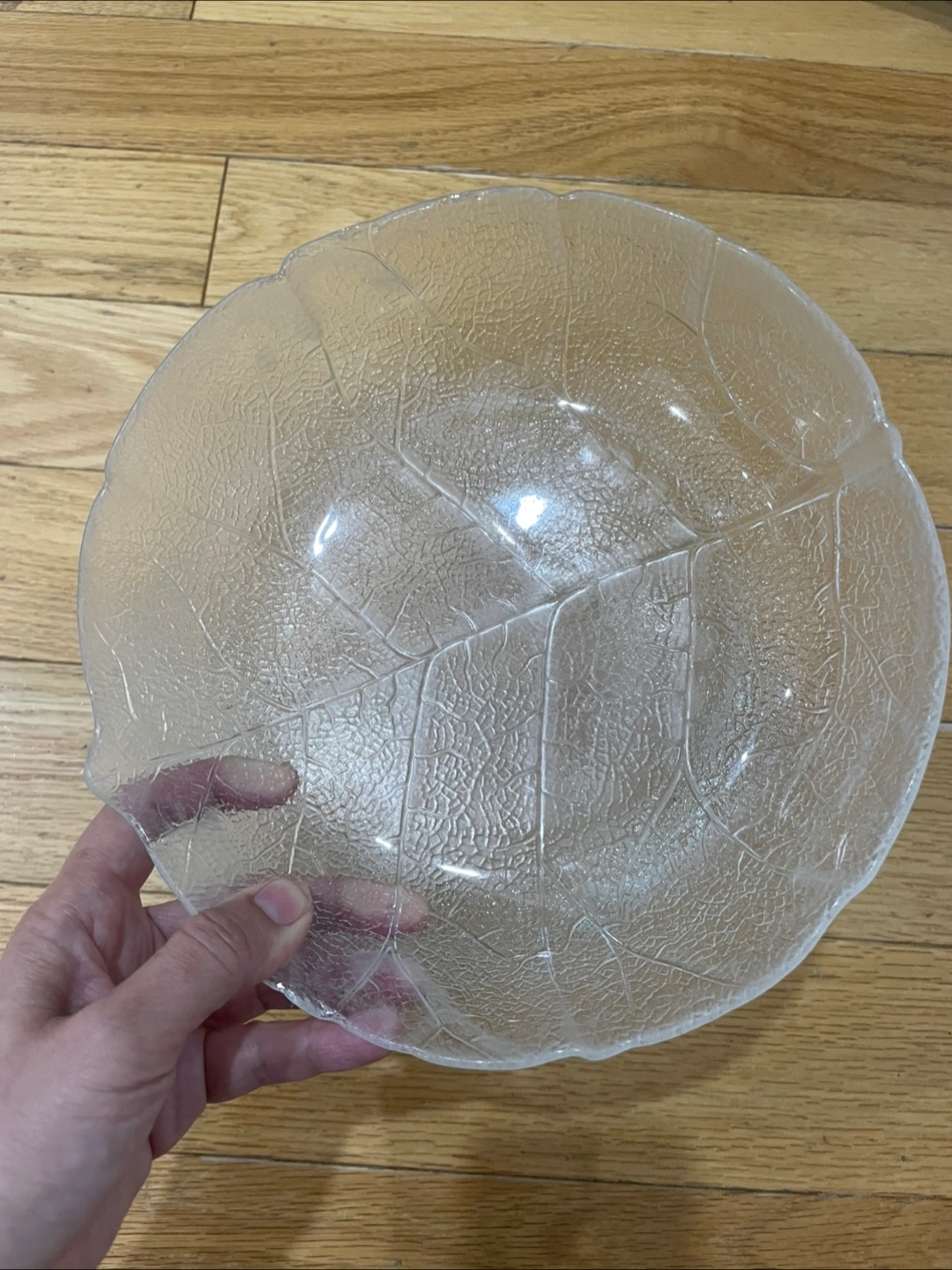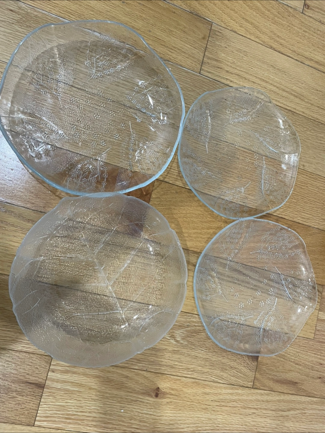 91Selling a set of four glass serving bowls with a leaf pattern. They're perfect for salads, snacks, or desserts. They're in great shape and ready for a new home!