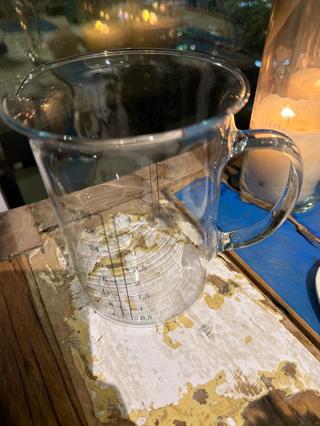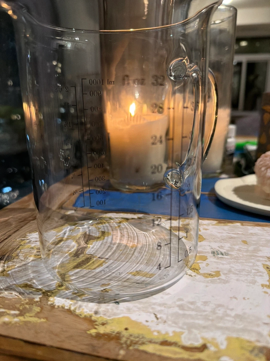 Selling a clear glass measuring cup! It has measurements marked in ounces and litres. Great for baking or cooking
