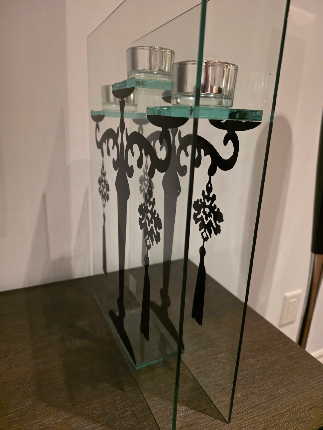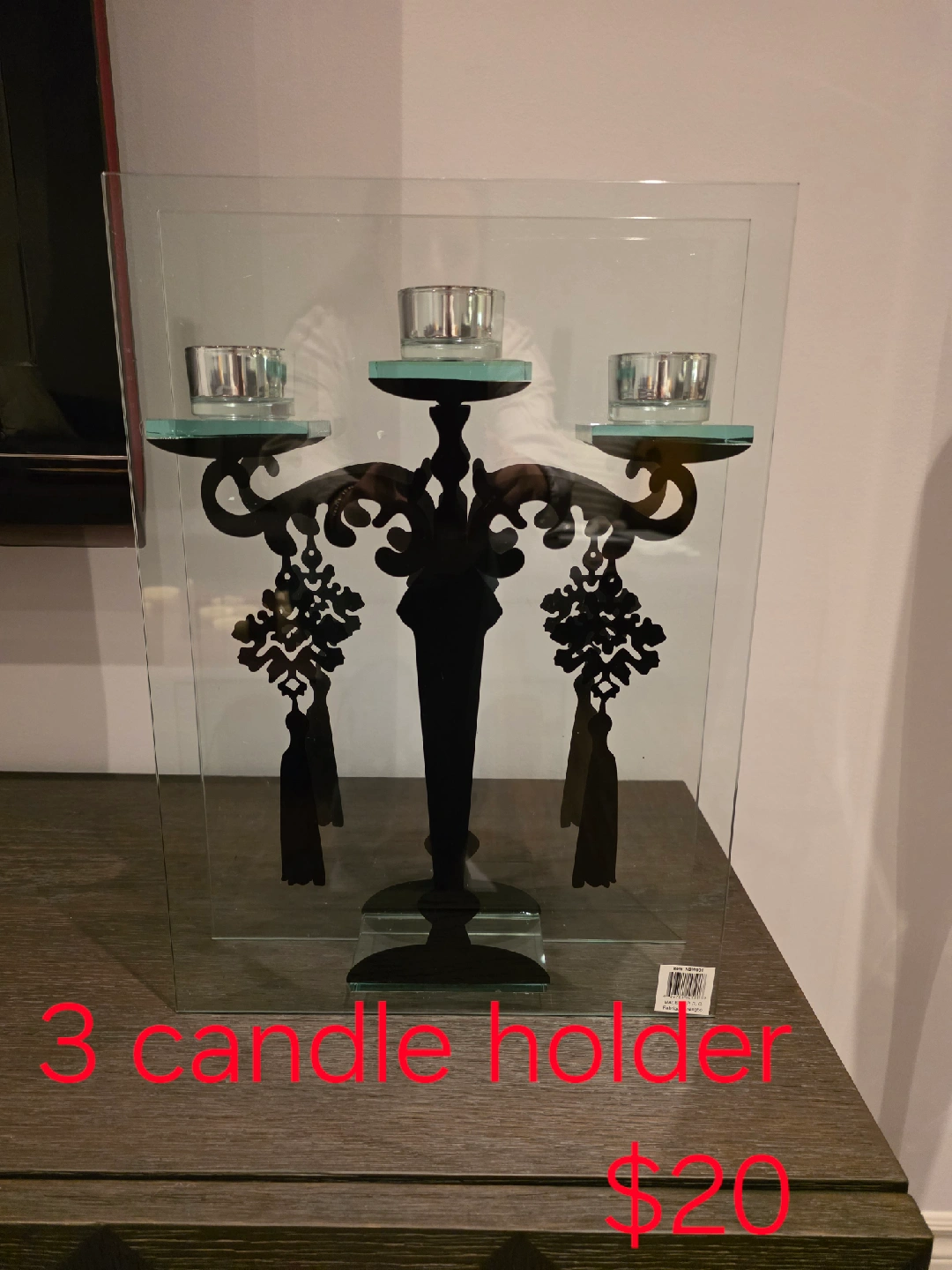 82Selling a lovely glass and metal candle holder that holds three candles. It's in great condition and would look beautiful in any room! It's a stylish and elegant piece to add to your home decor