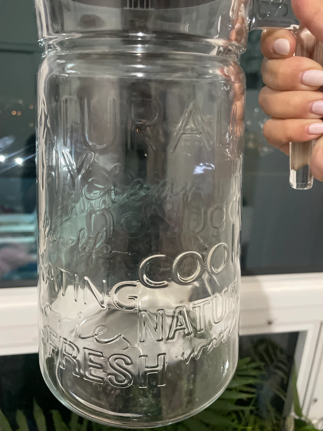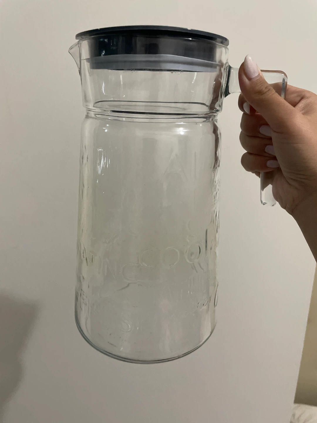 85Selling a glass pitcher with a lid. It's in great shape and ready to hold your favourite beverages! The pitcher has some embossed writing on the side.
