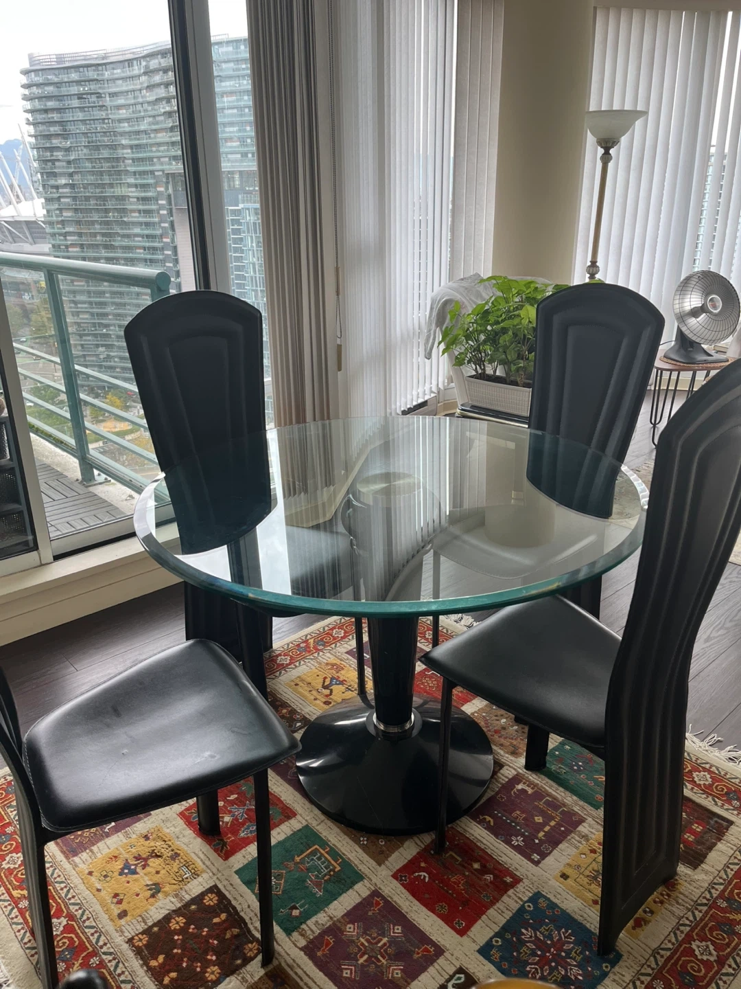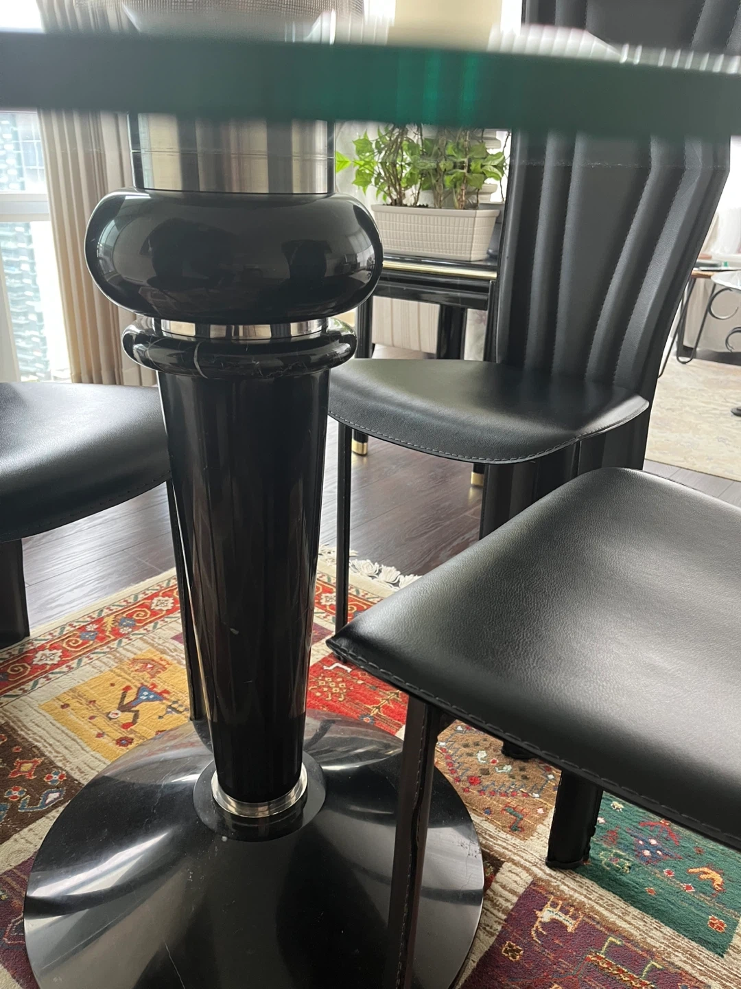 10Selling a round glass dining table with four black chairs. It's a stylish set that would look great in any dining room or kitchen! The chairs have a sleek, modern design that complements the table nicely. The column is marble.