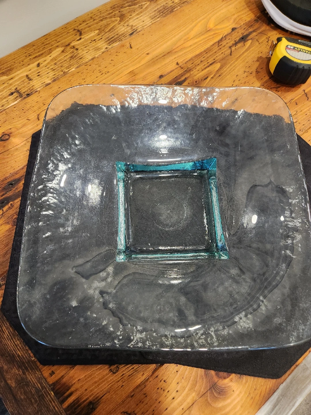 60Here's a lovely glass serving bowl, perfect for adding a touch of elegance to your table! It features a unique square design with a slightly wavy edge. It's in great shape and ready to be used for your next gathering