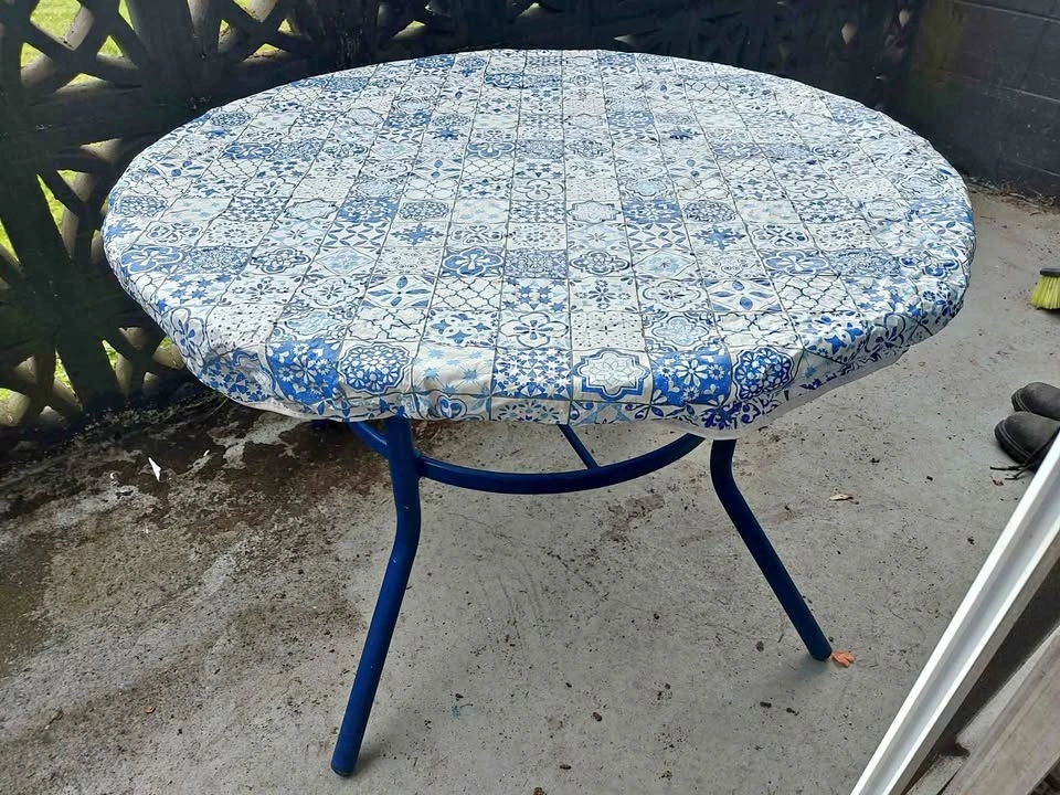 20Glass table with a holder/space for an umbrella. Comes with a beautiful cover from Etsy, which is machine washable and waterproof. Great as a dinner table or as patio furniture. Easy to disassemble and repaint if needed.