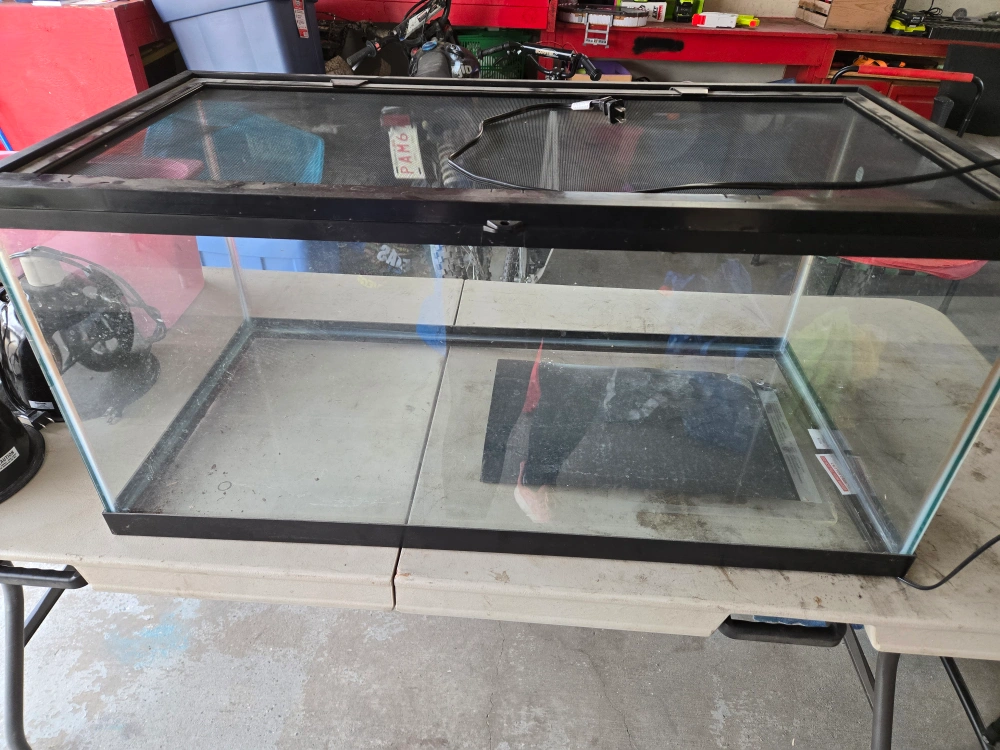 Selling a glass terrarium tank, perfect for reptiles or small animals. It comes with a screen top to keep your pets secure and provide ventilation. The tank is in good condition and ready for a new home!