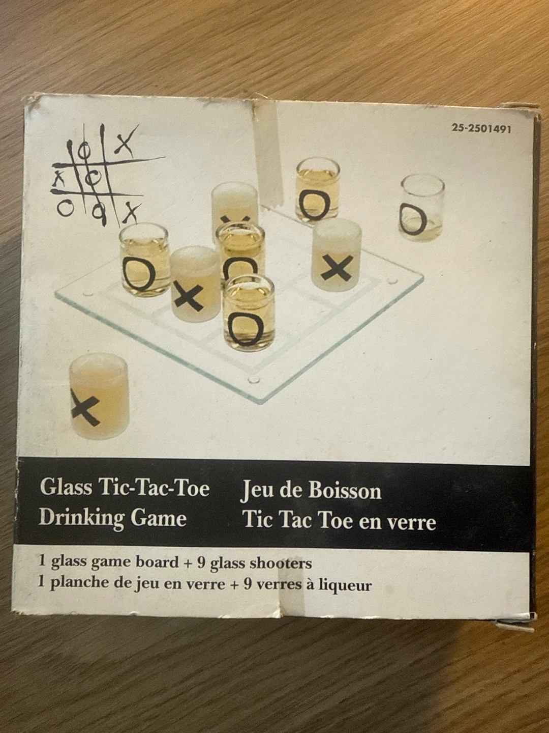 Selling a Glass Tic-Tac-Toe drinking game! It comes with a glass game board and 9 glass shooters. Perfect for a fun night in!