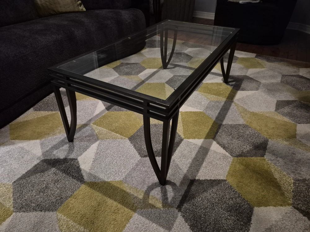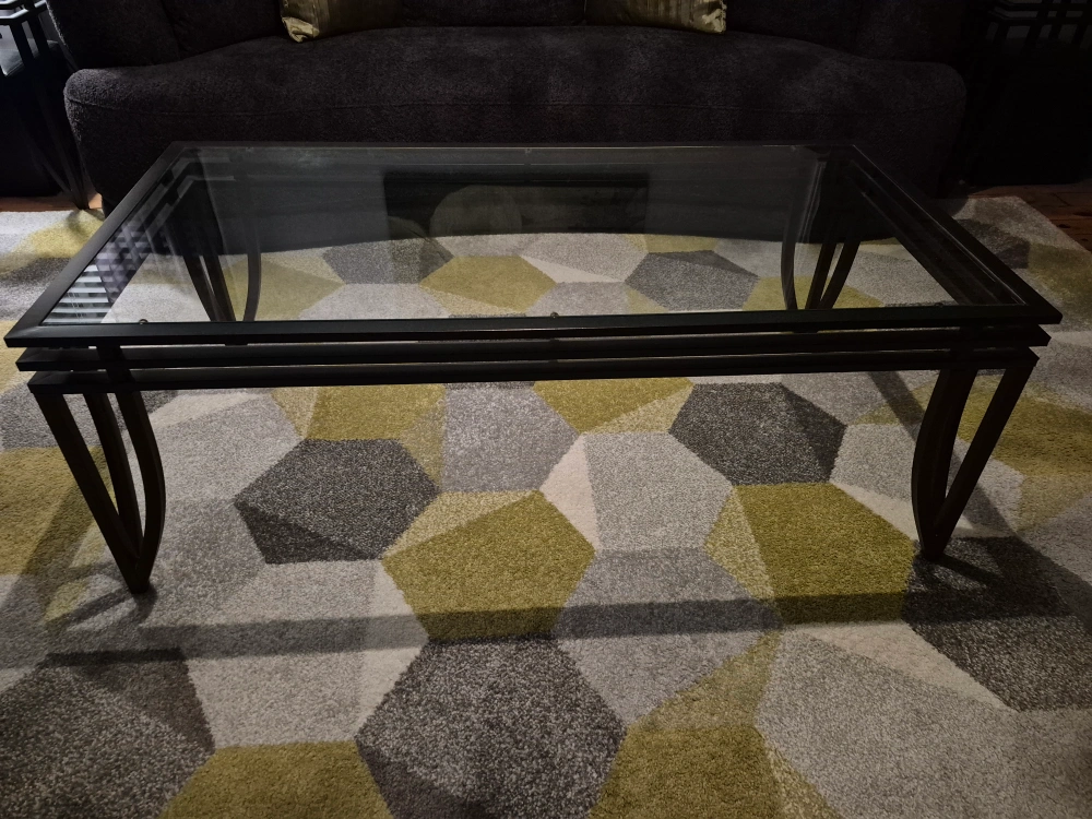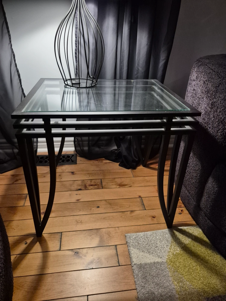 Selling a glass top coffee table and end tables. It has a sleek design with a dark metal frame and a clear glass top. Perfect for adding a modern touch to your living room or as a stylish side table