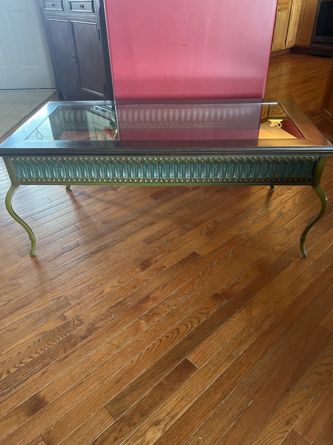 21Selling a solid coffee table with a glass top. It has a dark wood frame and decorative metal leaf detailing on the sides. The legs are metal and a unique curved shape. It would be a great addition to any living room!