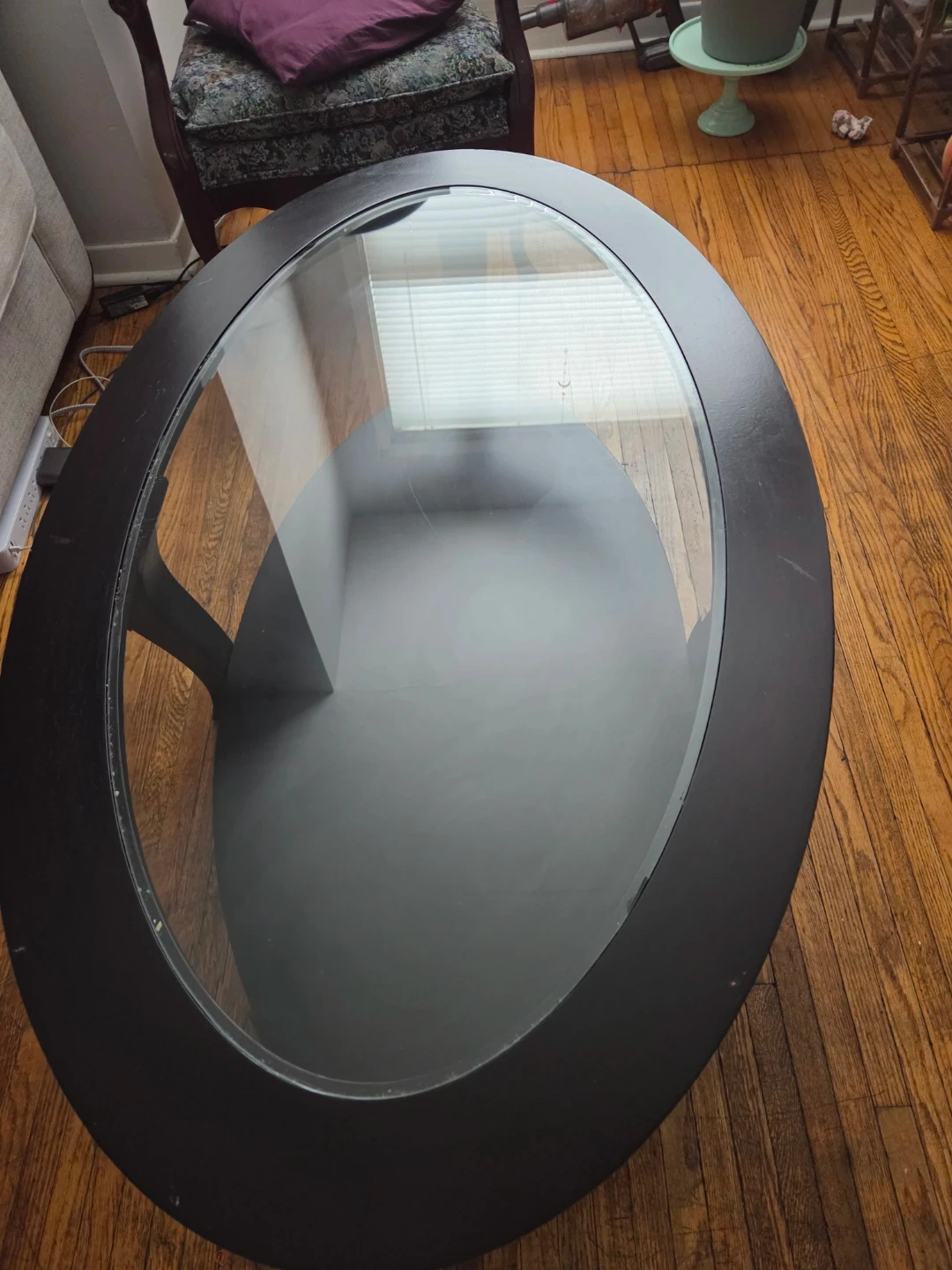 86Selling a blackish brown coffee table glass top, not in the greatest condition does have scratches on the glass.Could use a redo for sure asking twenty five