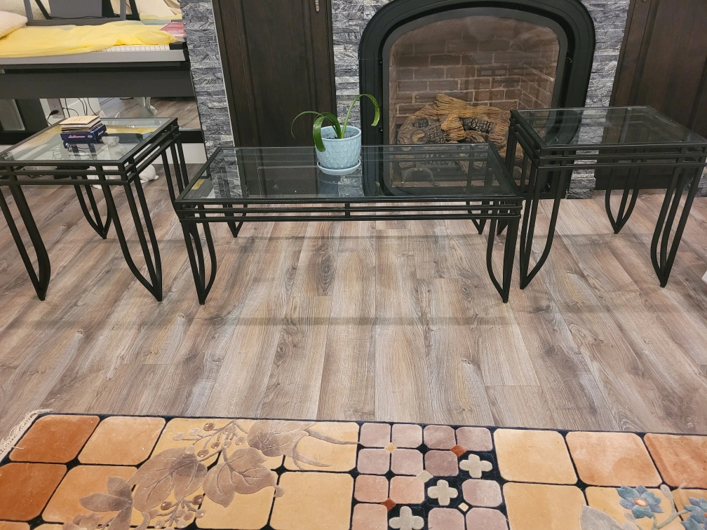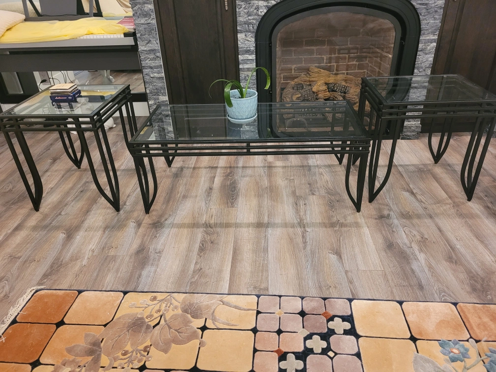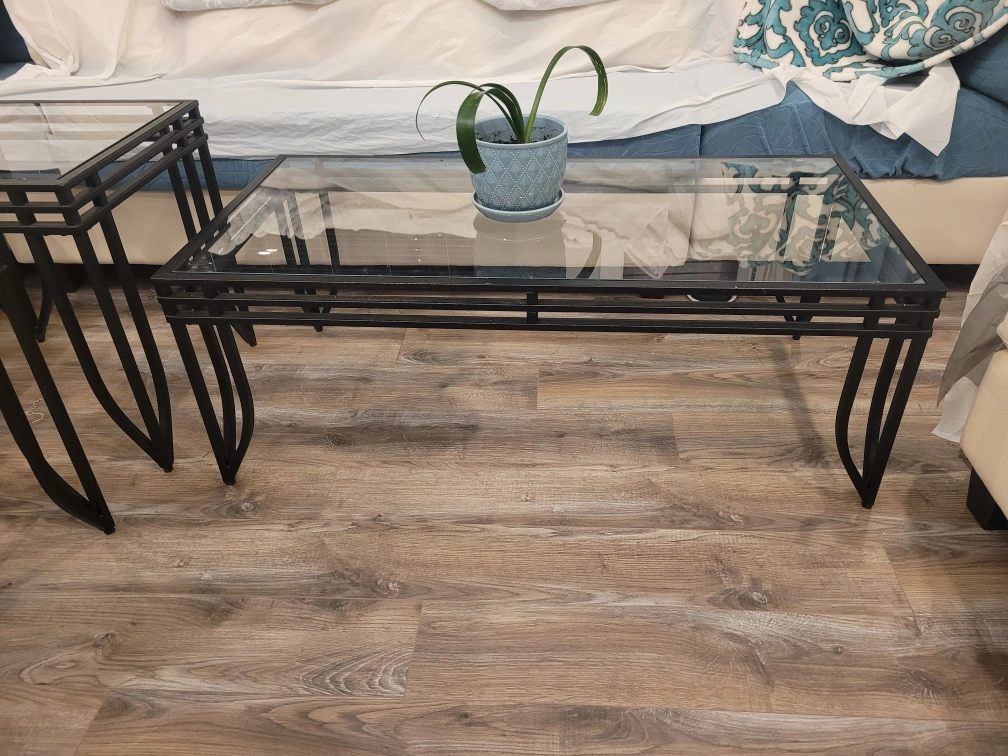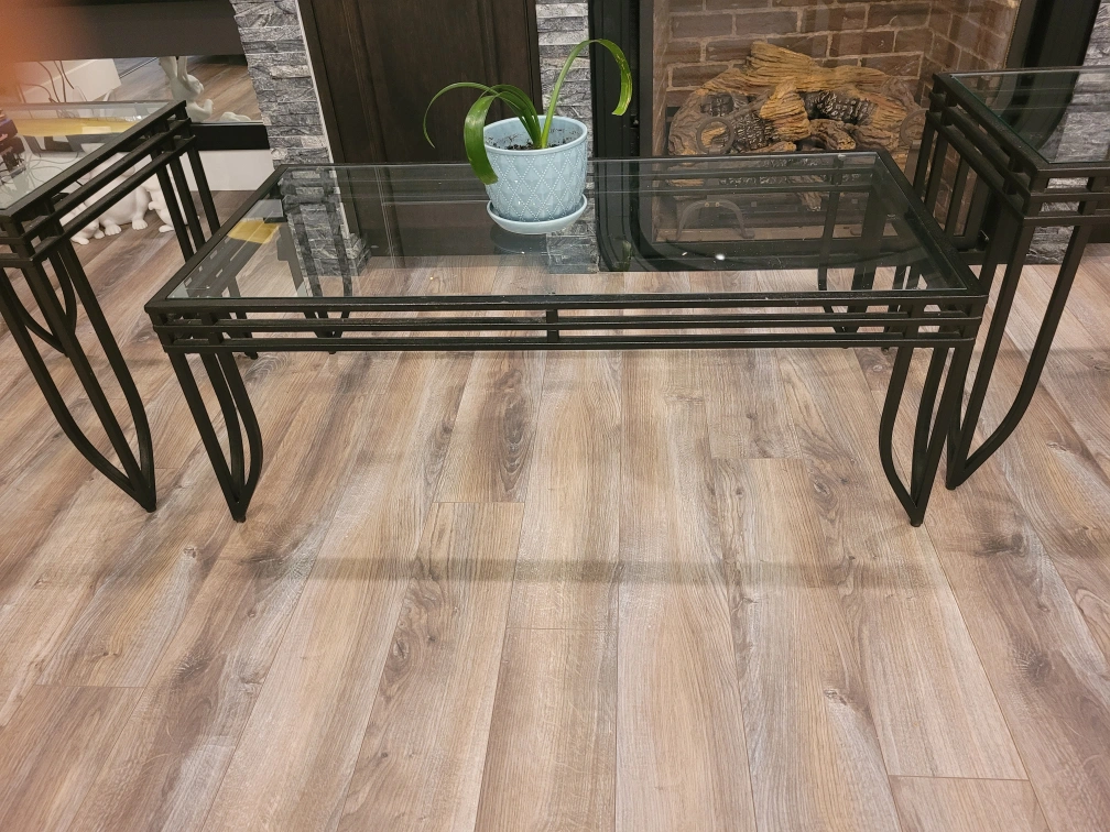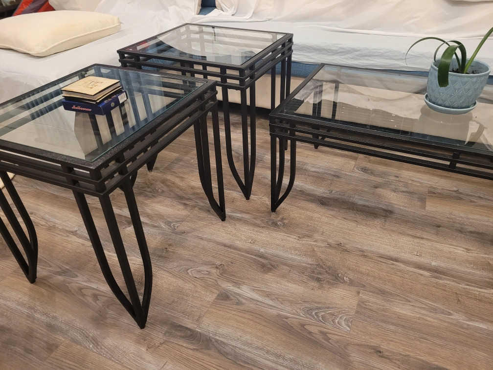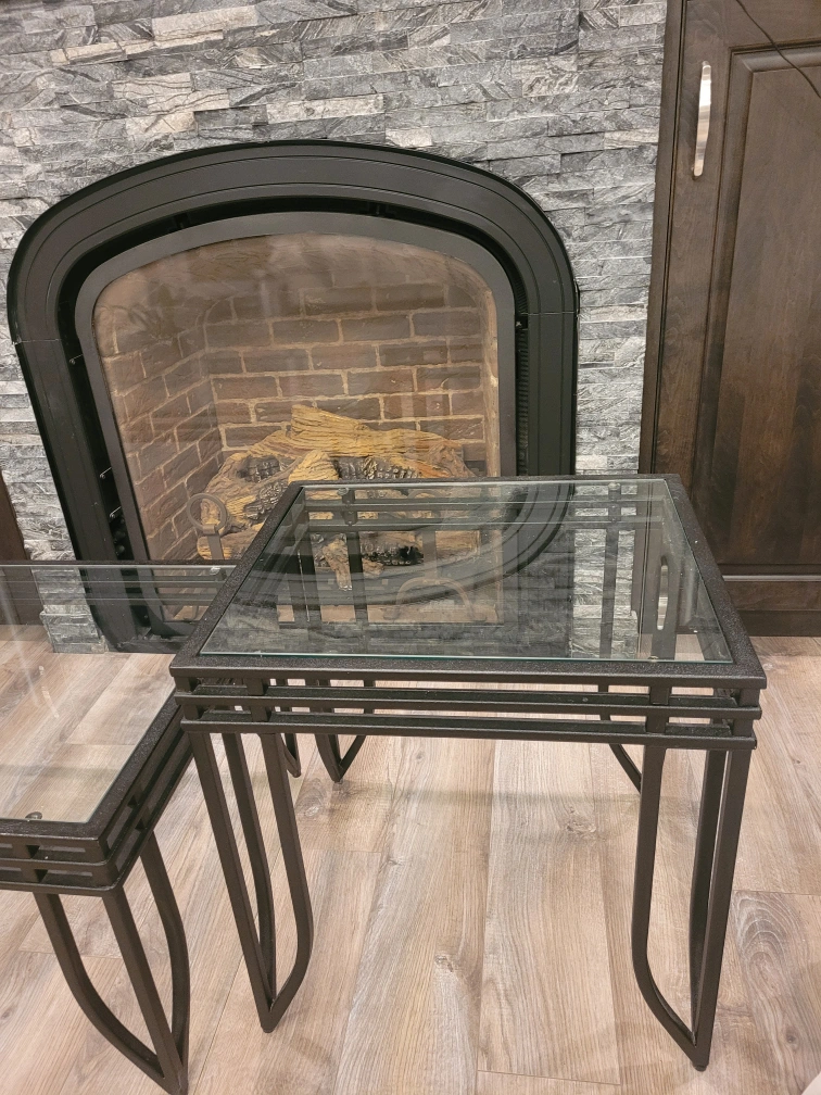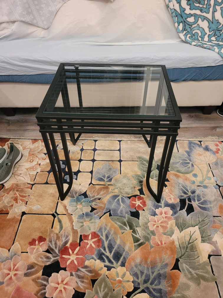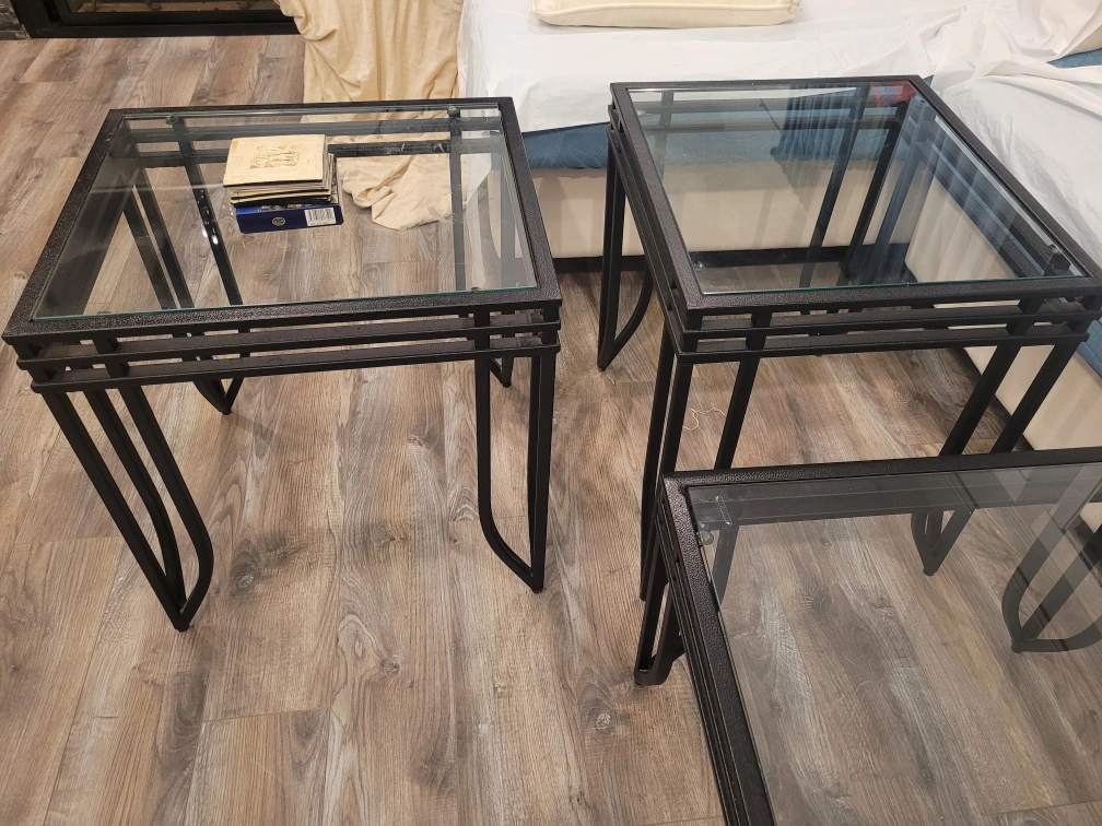 Selling a coffee table and two end tables with glass tops and dark metal frames. They're in great shape and would look lovely in any living room or den. Give me a decent offer