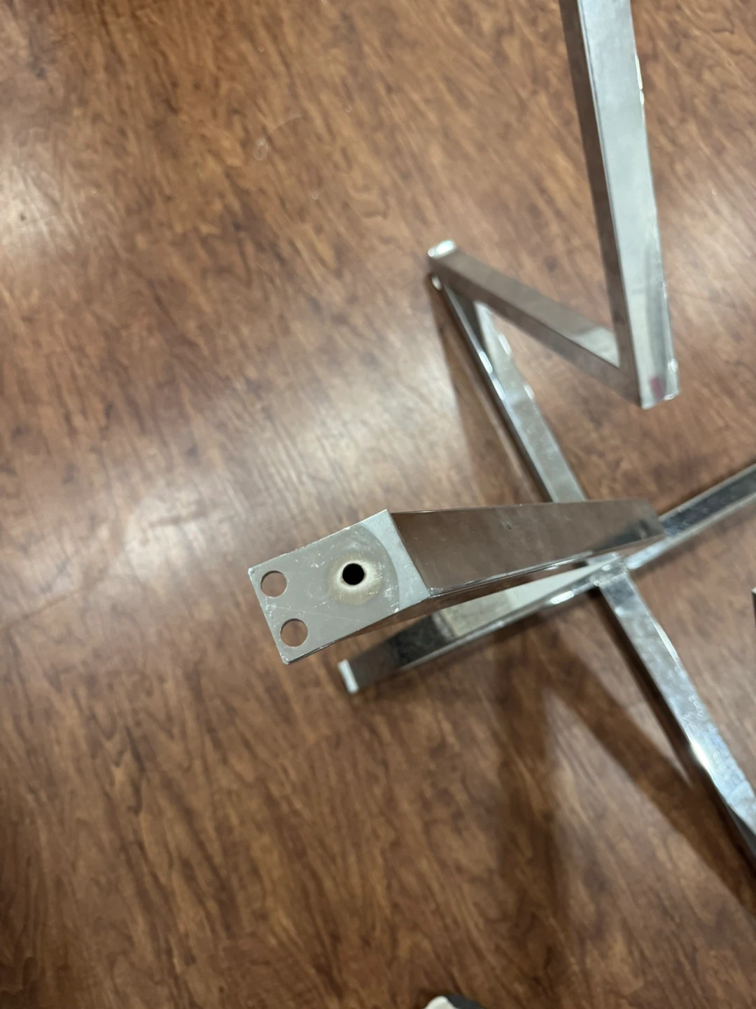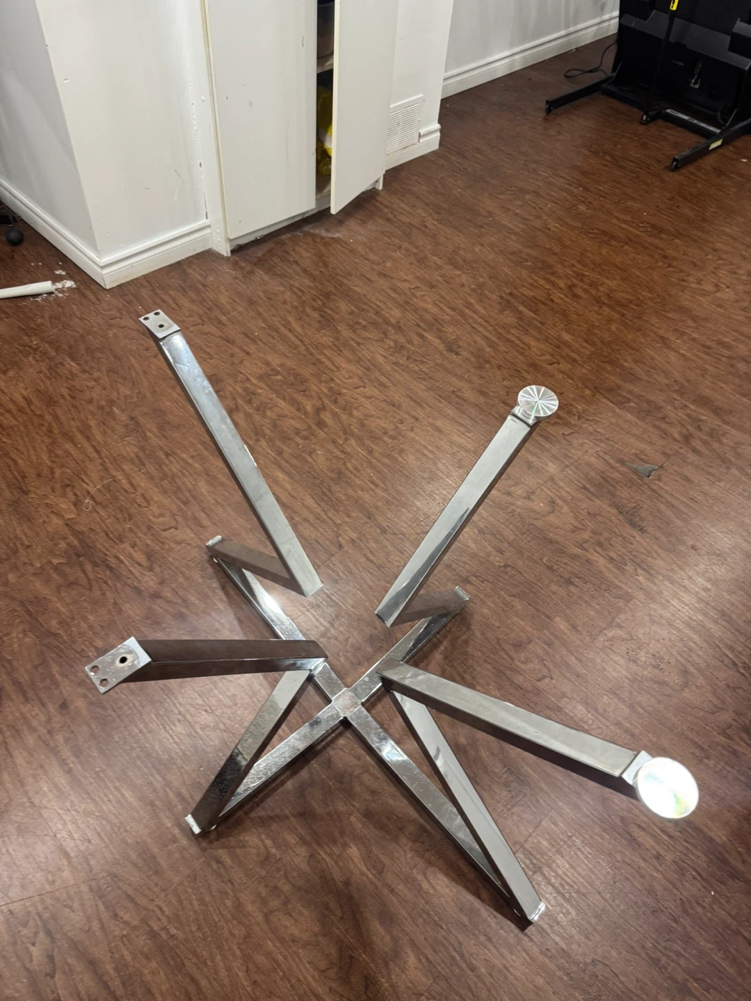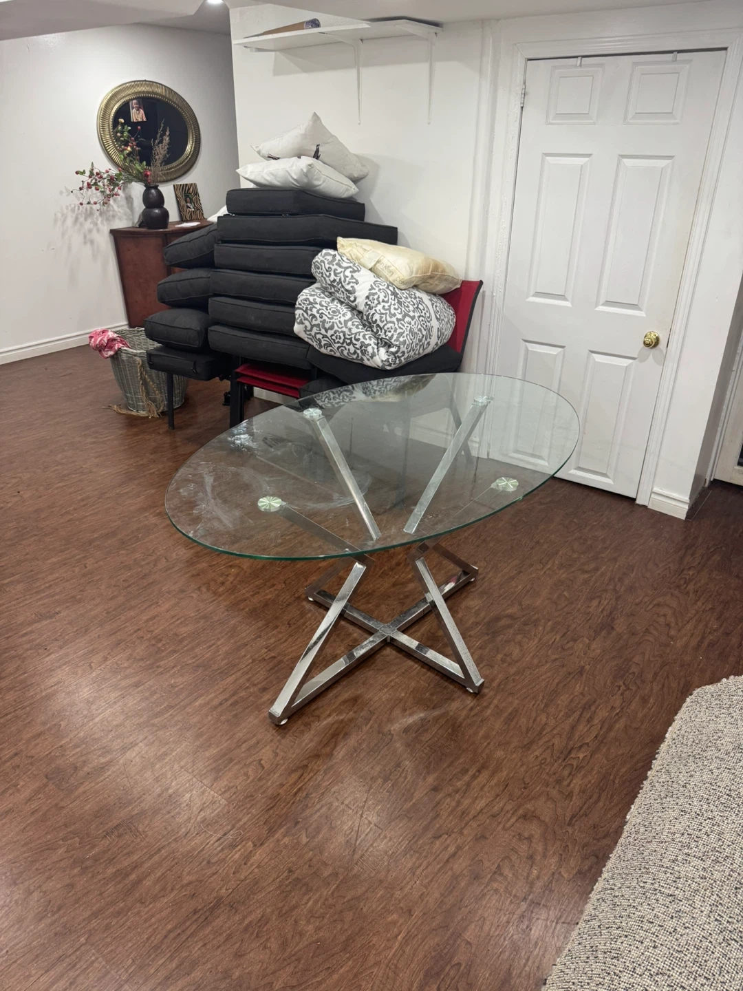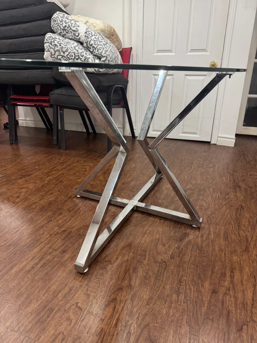 43Selling a coffee table with a glass top and a sleek chrome base. The glass is tempered for extra durability. It's in good condition and would look great in any living room! AS SEEN IN LAST PIC, the two circle pieces that attach to the glass have to be reglued onto the glass again as seen as the other two pieces that are still attached. It’s been sitting for about a year in our basement so time made it stick. It’s an easy fix, just get highly sticky glue and attach them to the glass. Other than that, no dents, or anything minor. $100 obo