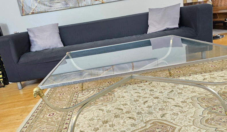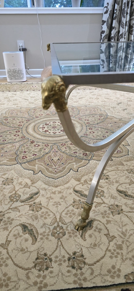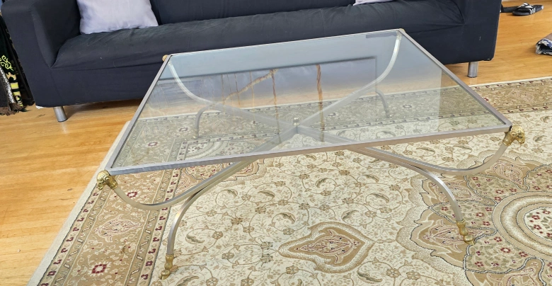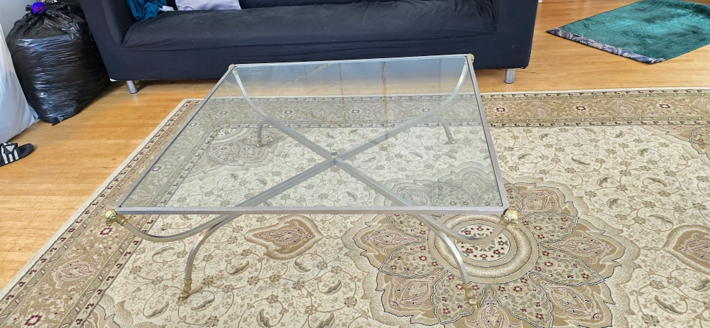 77Selling a stylish coffee table featuring a glass top and a sturdy metal frame. The table has a unique design with decorative accents. It would be a great addition to any living room! dimensions 42"x42" selling for $90 obo free delivery within reasonable distance