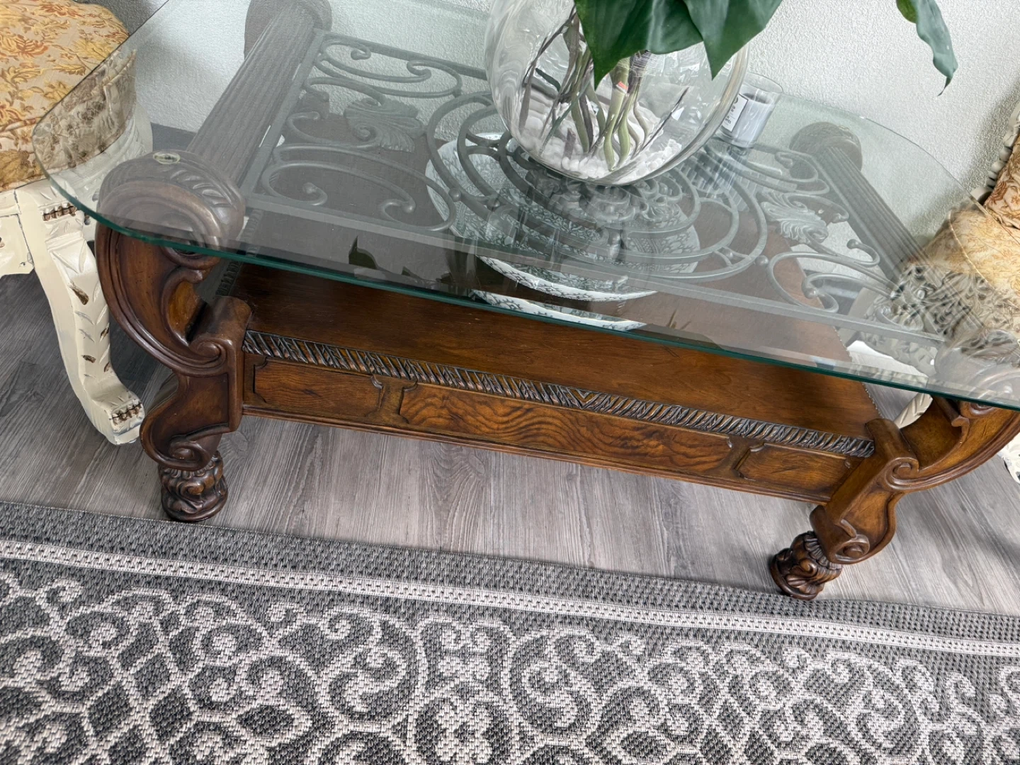 10Selling a beautiful coffee table with a glass top and a decorative metal and wood base. It's in great shape and would add a touch of elegance to any living room. The ornate details on the base are really eye-catching!