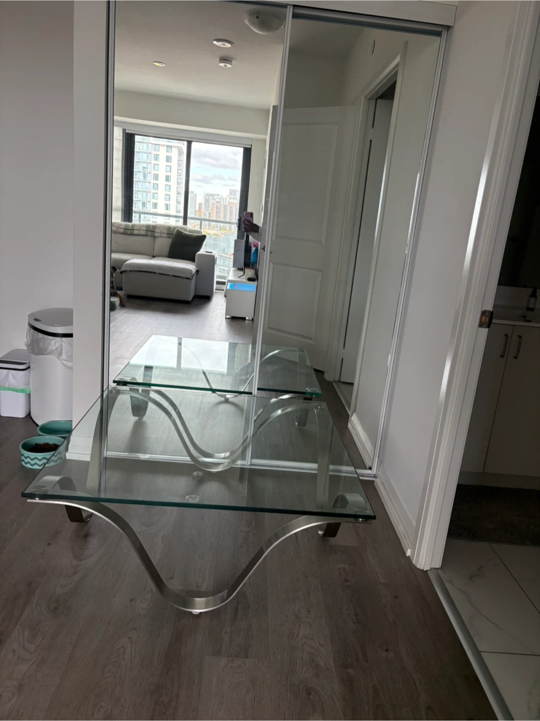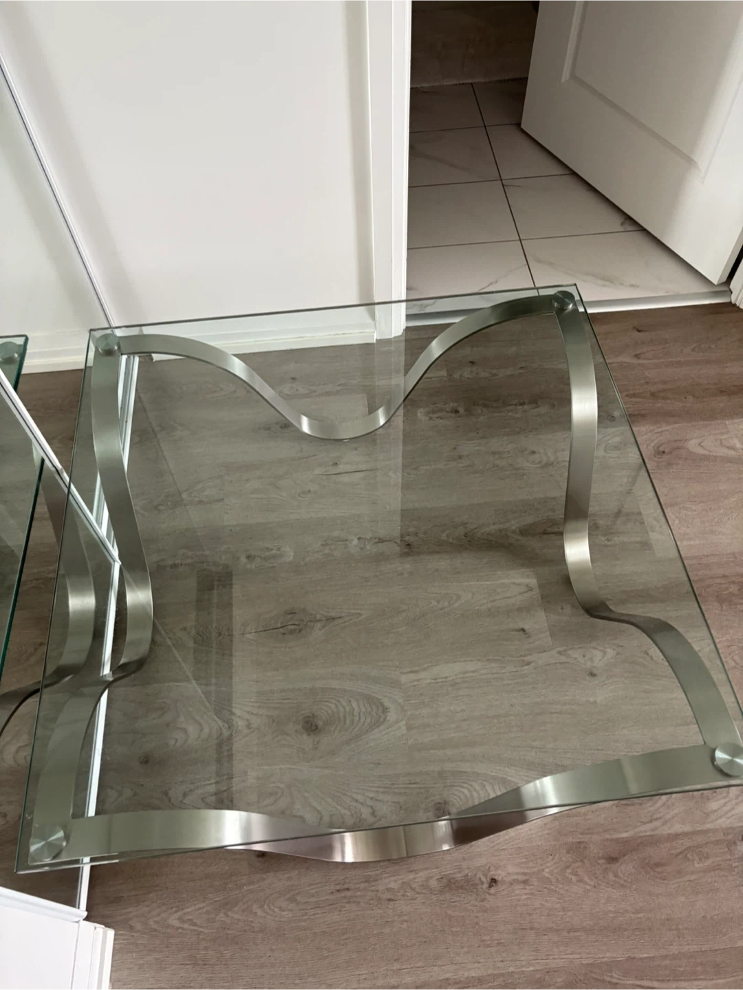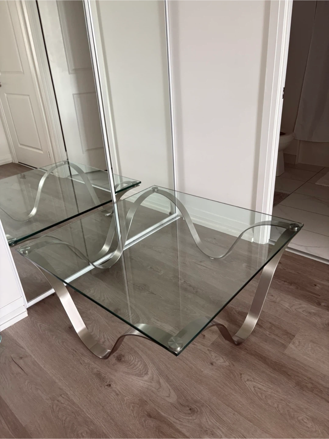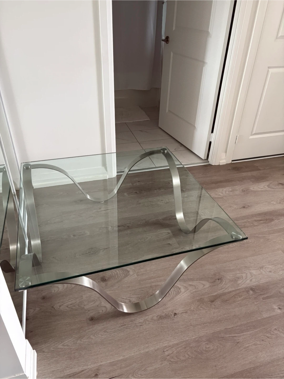60Selling a stylish coffee table with a glass top and a unique silver metal base. It's in great shape and would look lovely in any living room