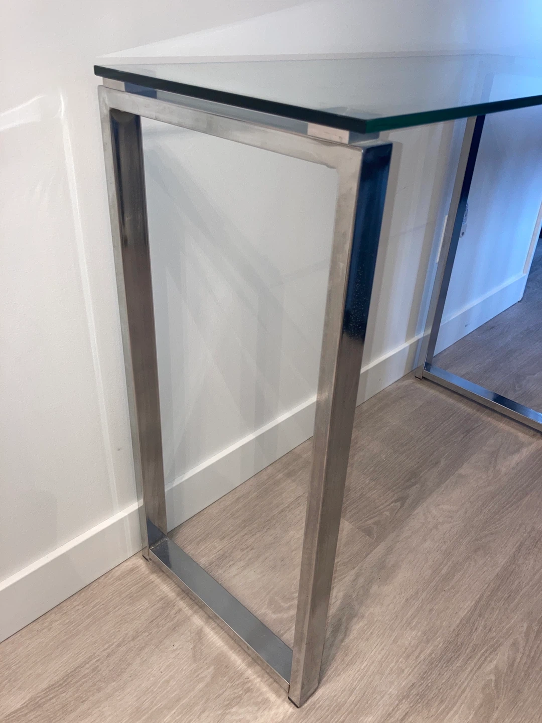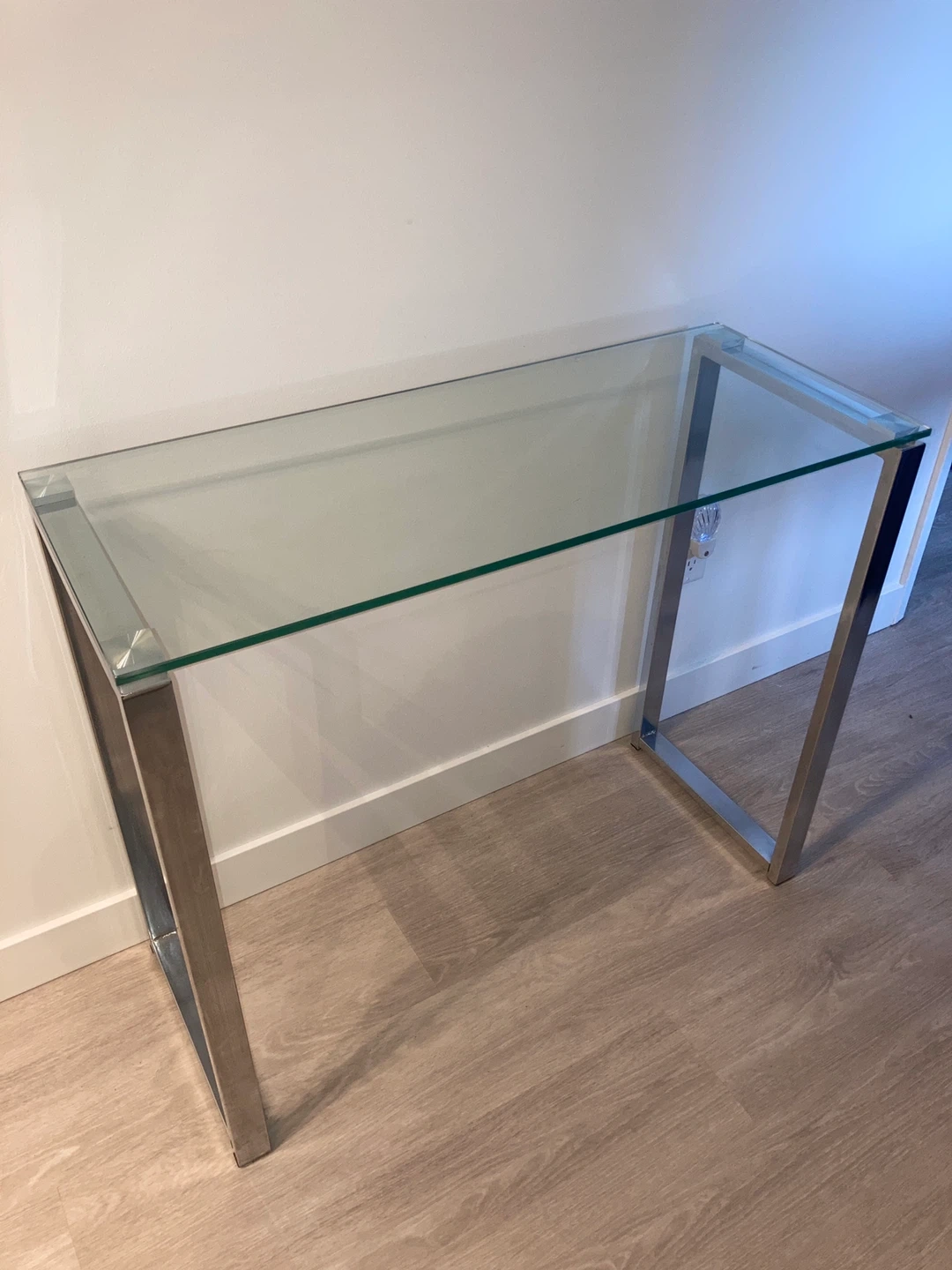 Selling a sleek console table with a glass top and a metal frame. It's in great condition and would look great in any entryway or living room. This table is sturdy and stylish, perfect for adding a touch of modern elegance to your home