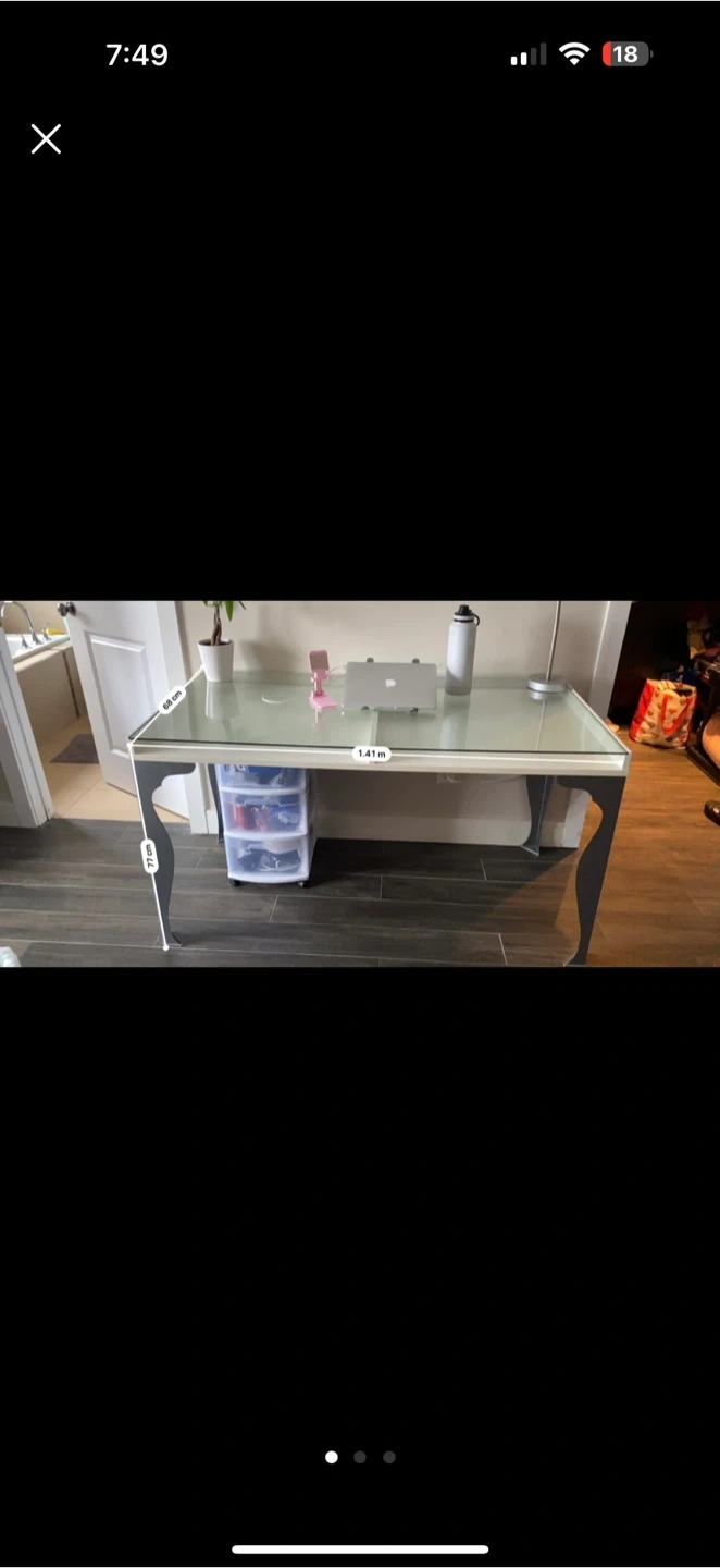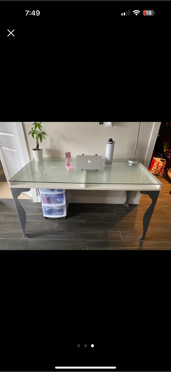 Selling a glass top desk with stylish grey legs. It's a great addition to any home office or study space. The desk is sturdy and in good condition, ready for a new home!