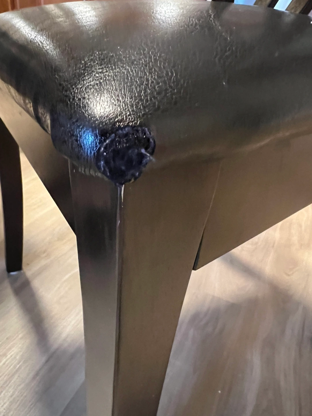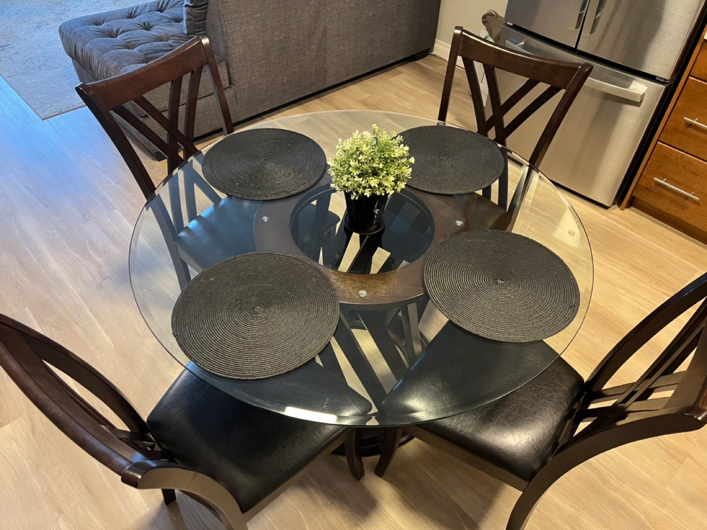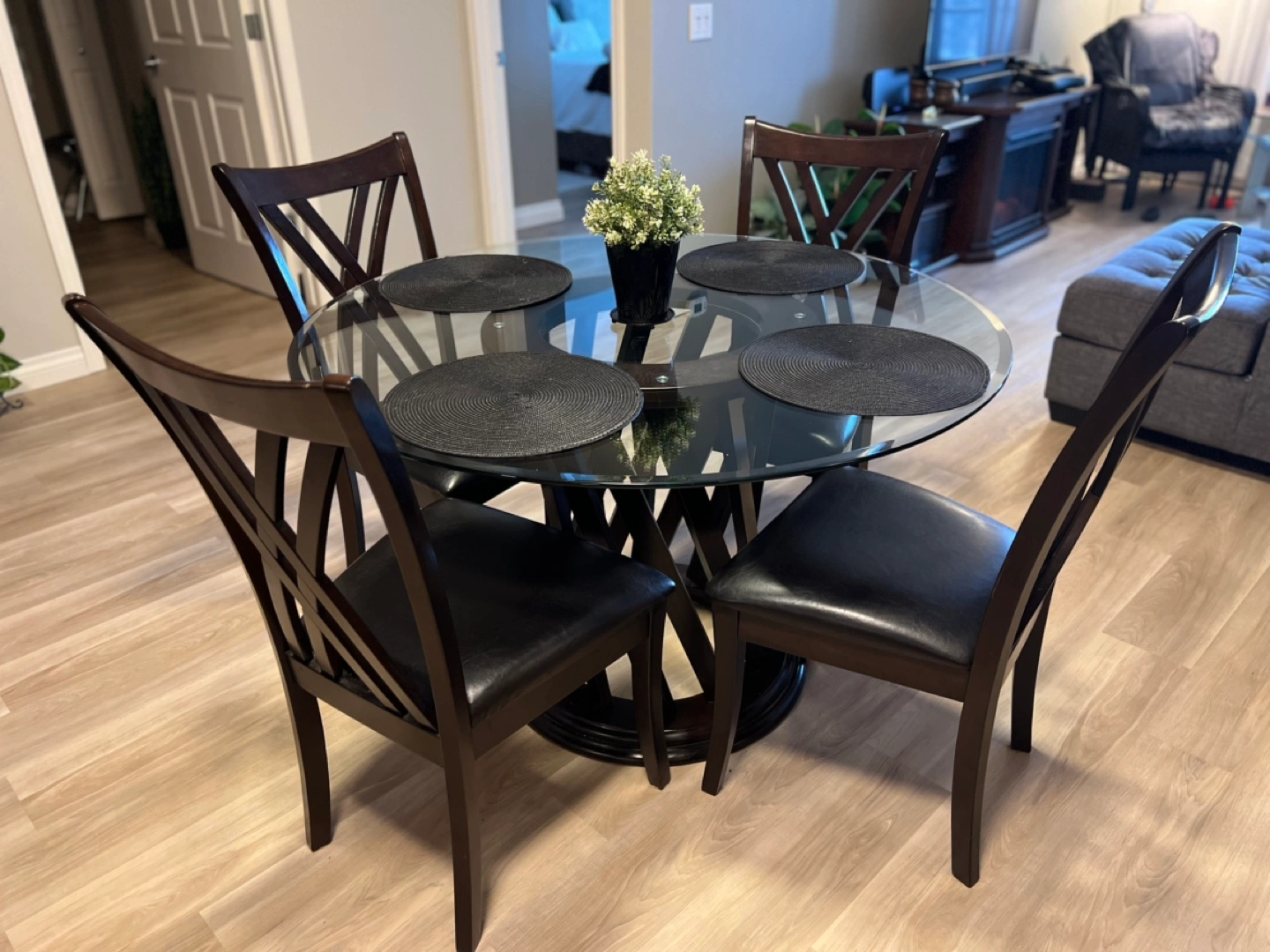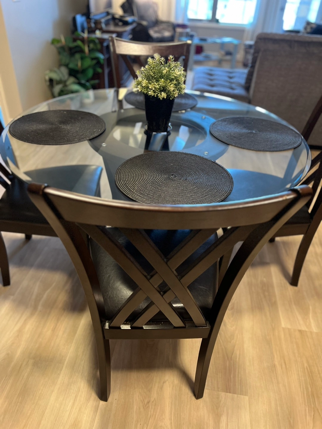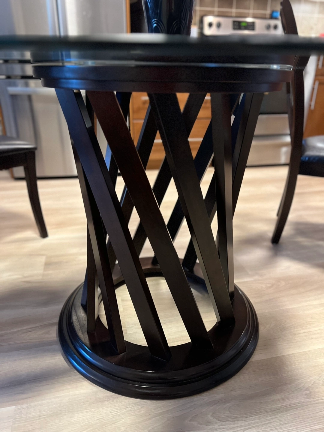 15Glass top dining table with four chairs. The chairs have faux leather seats and dark brown wood frames. The table has a beveled glass top with a beautifully designed wood base. A few scuffs on the glass top and one of the chairs as shown in the photo.