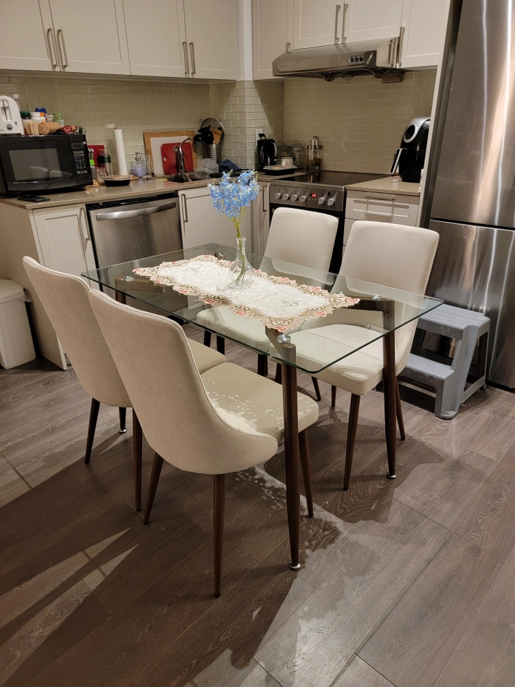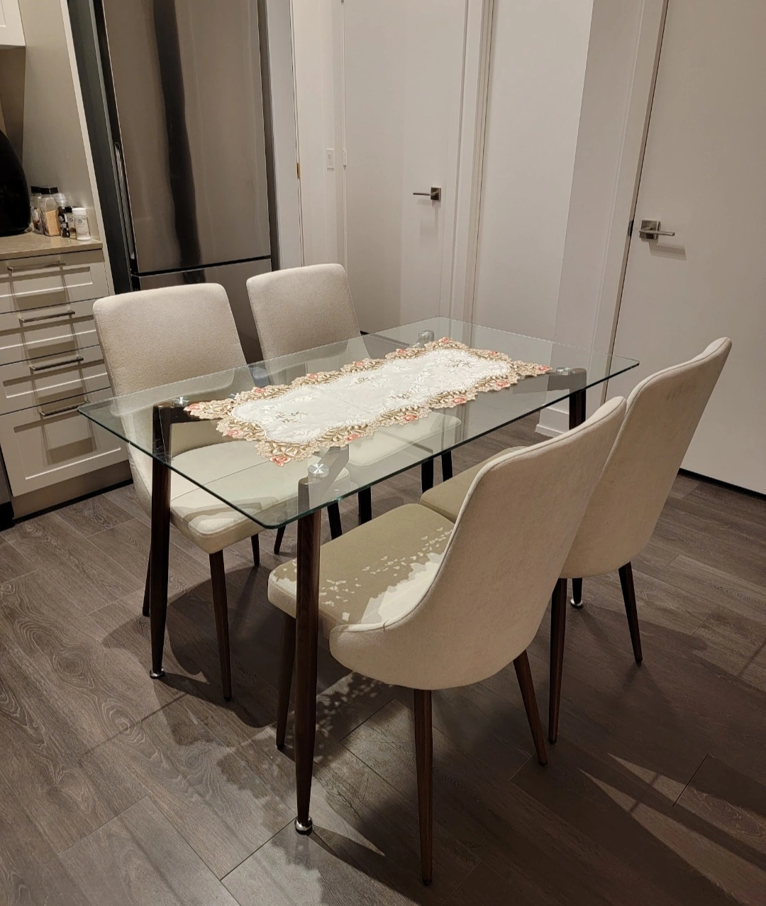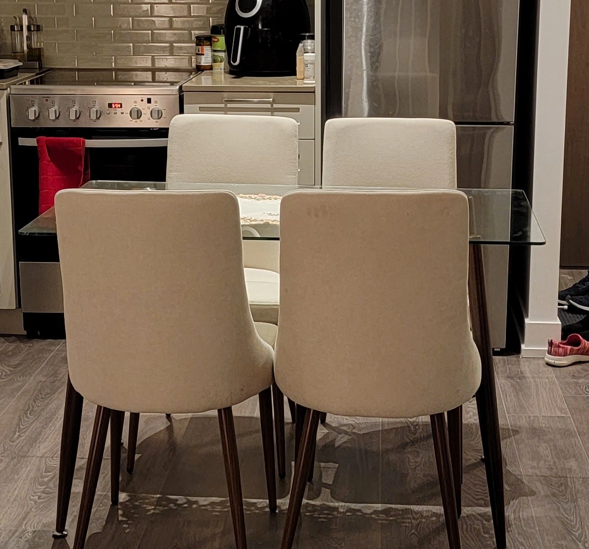 73Selling a dining table with a glass top and four matching chairs. The chairs are upholstered in a neutral, light beige fabric and have dark brown legs. This set would be perfect for a small dining area or kitchen nook.
