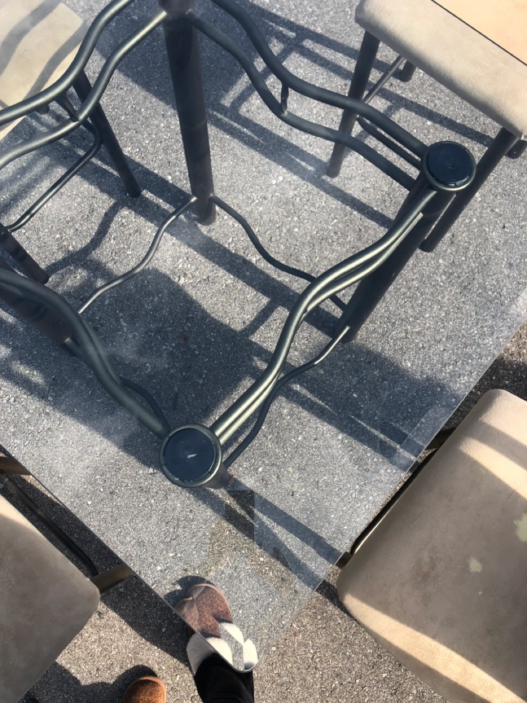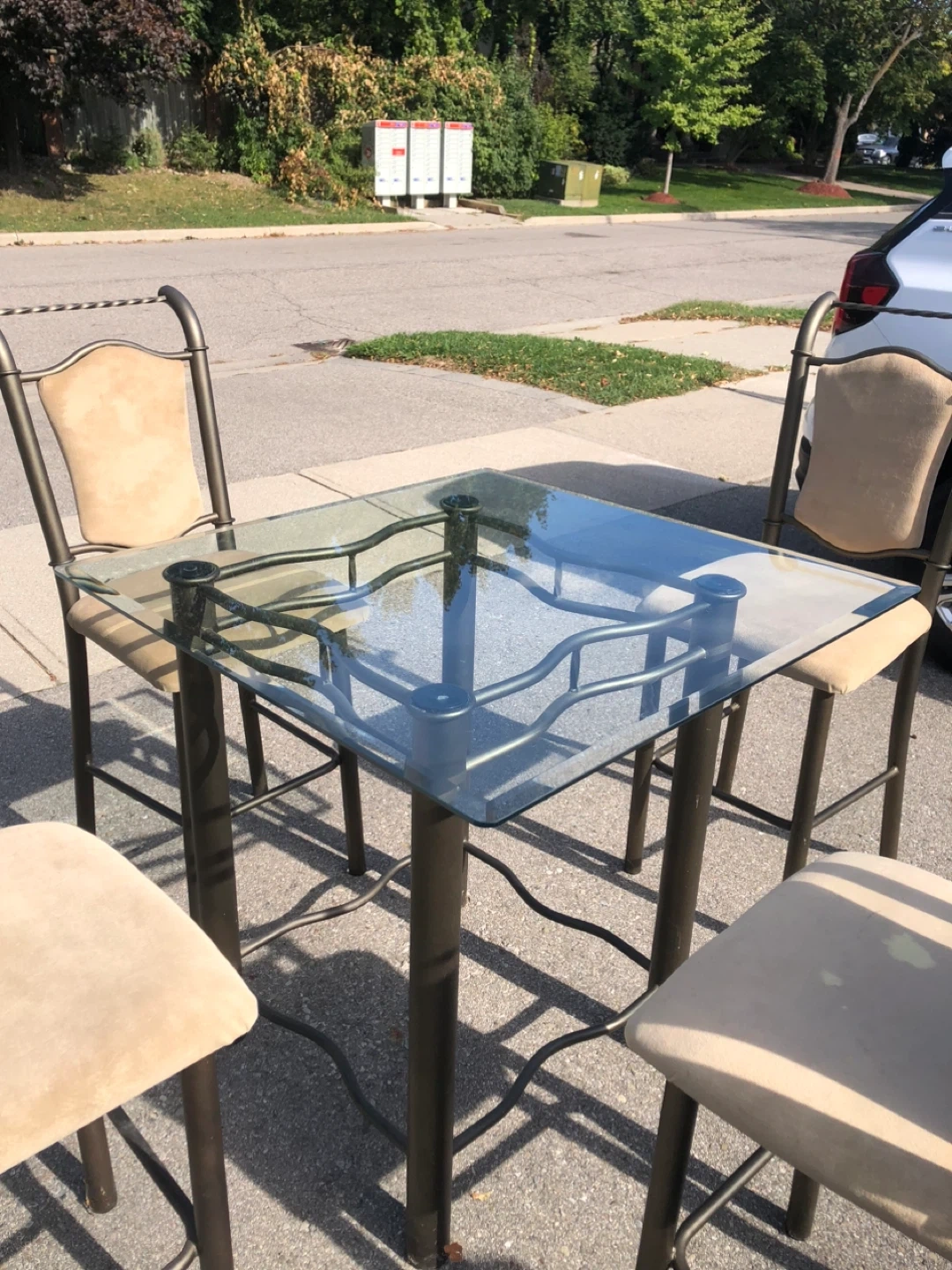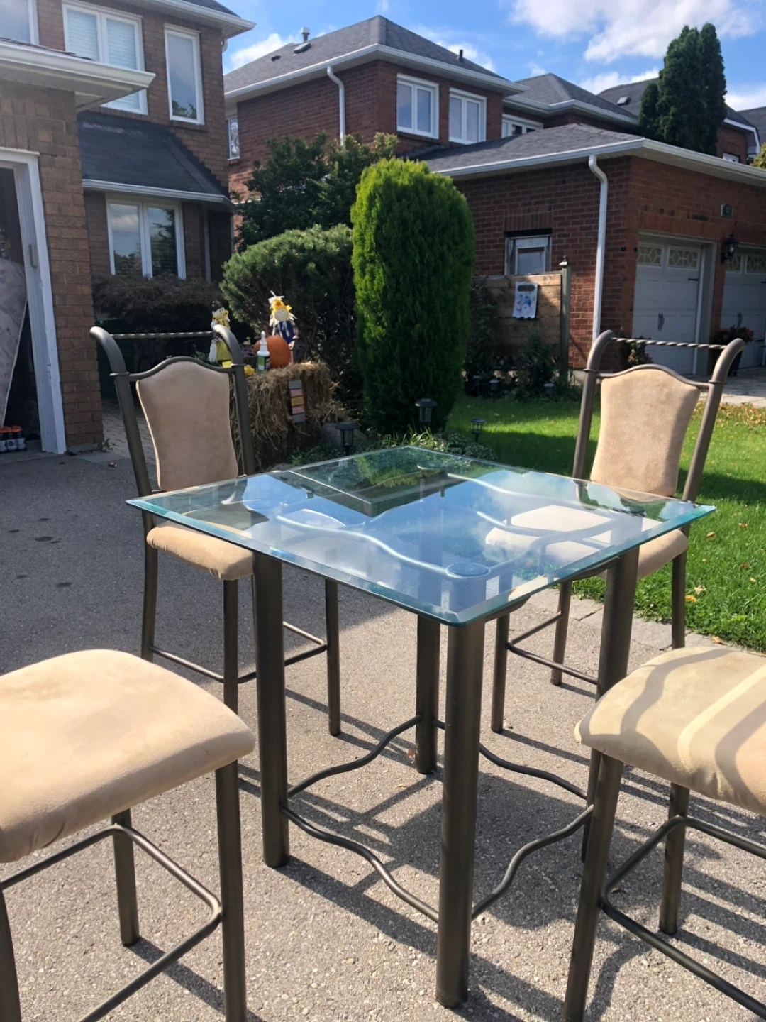Selling a glass high top dining table with four matching chairs. The table features a sleek, modern design with a clear glass top and a dark metal frame. The chairs are upholstered in a neutral, beige fabric that complements the table perfectly. A great set for a smaller dining space or kitchen!