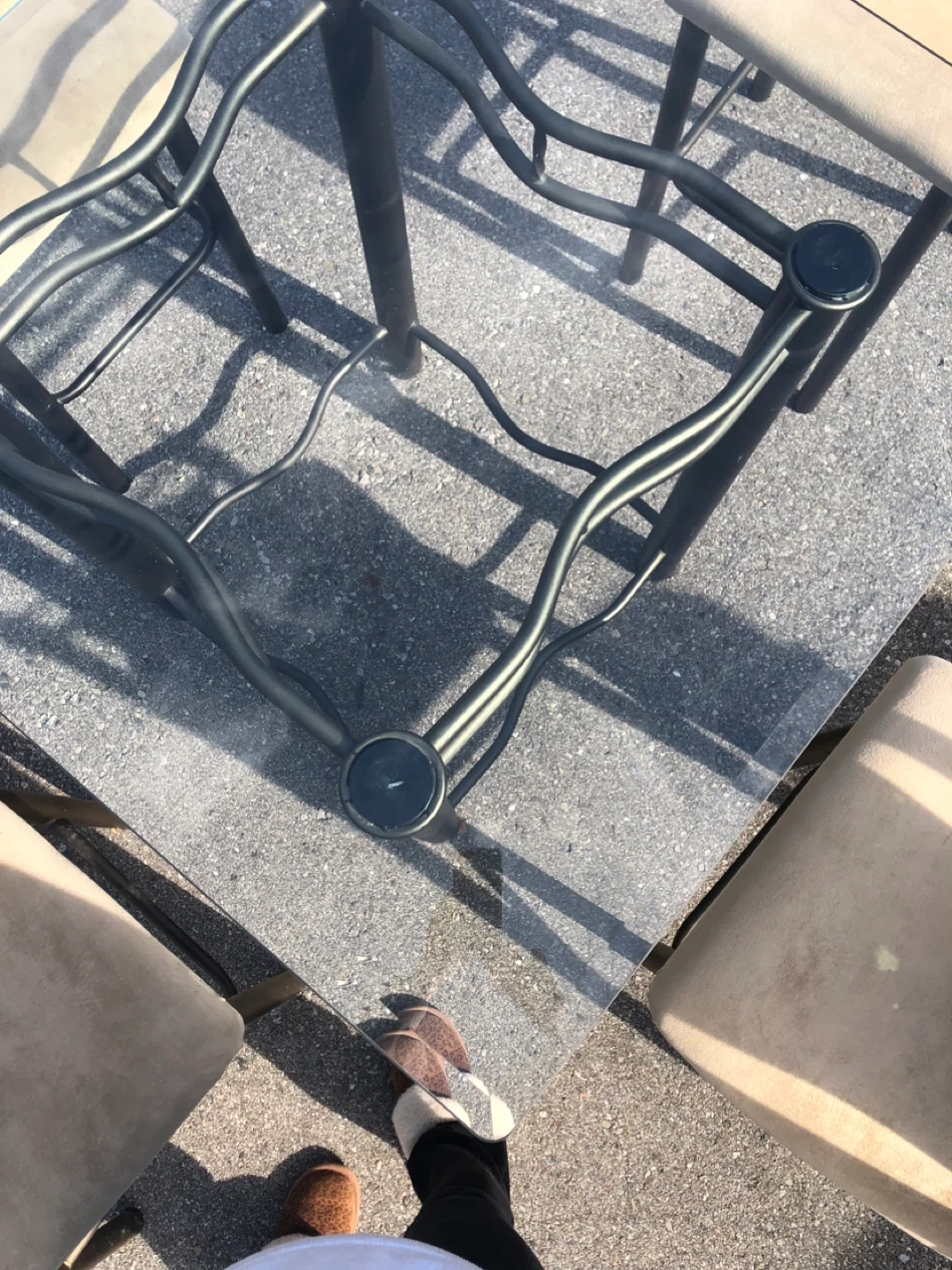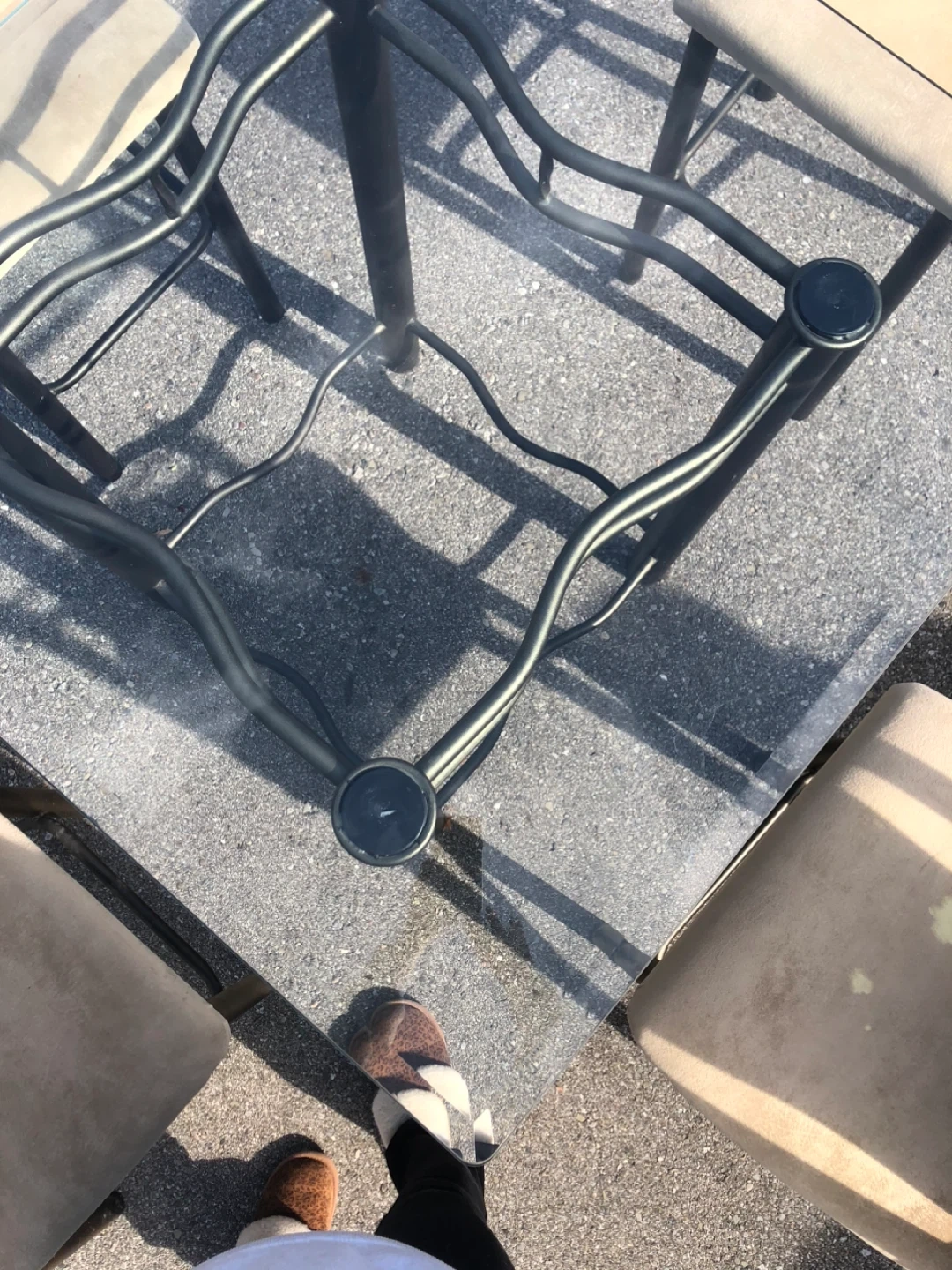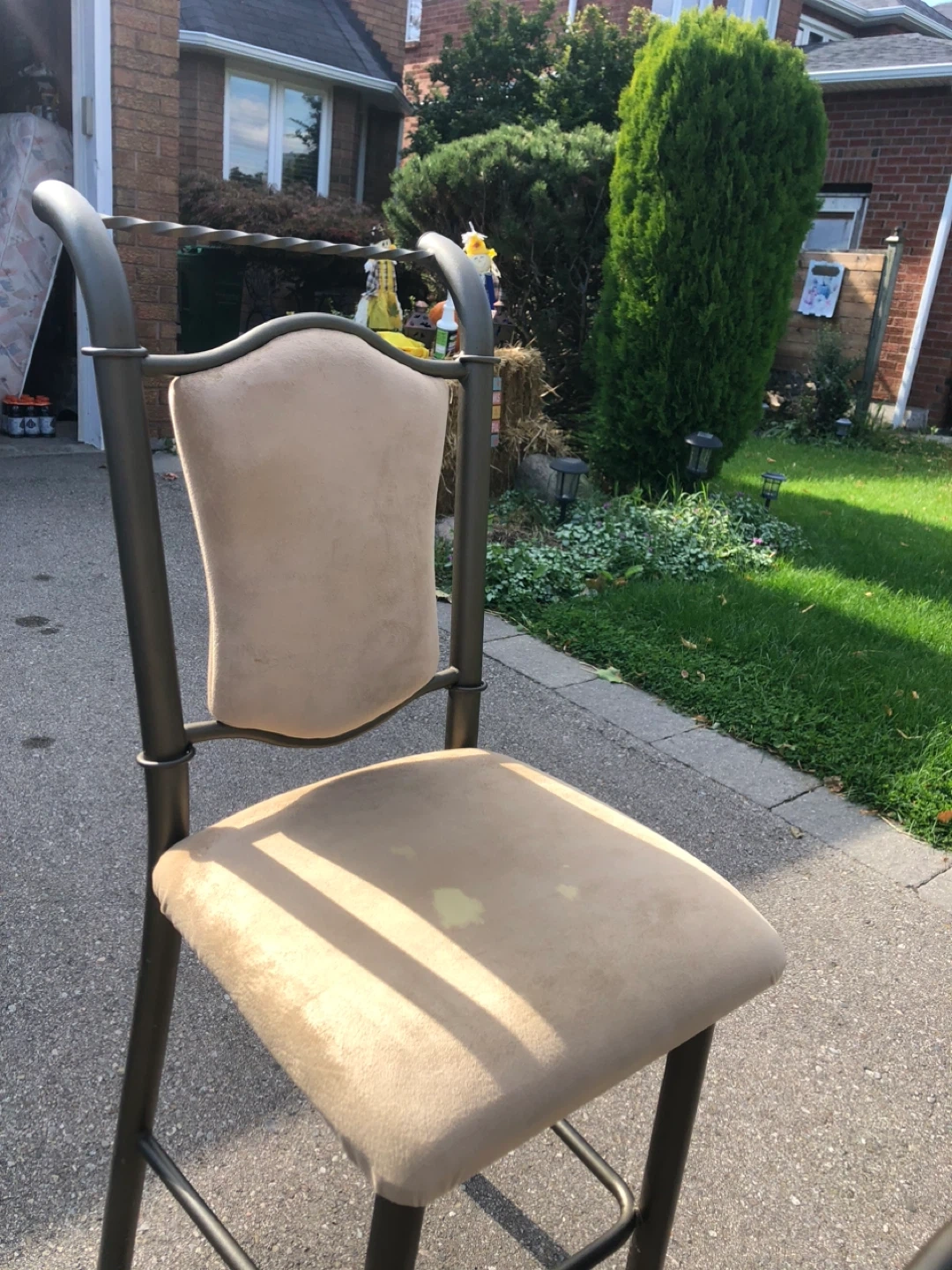 Selling a glass high top dining table with four matching chairs. The table features a sleek, modern design with a clear glass top and a dark metal frame. The chairs are upholstered in a neutral, beige fabric that complements the table perfectly. A great set for a smaller dining space or kitchen!