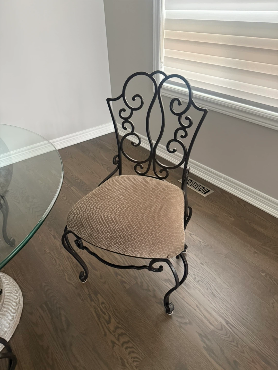 10Selling a beautiful glass top dining table with four wrought iron chairs. It’s in excellent condition. Used a handful of times. It’s wrought iron….not aluminum. It's a stylish set that would look great in any dining room or kitchen! The chairs have a lovely scrollwork design and comfortable cushioned seats. The table is round, perfect for smaller spaces. Paid $3700.