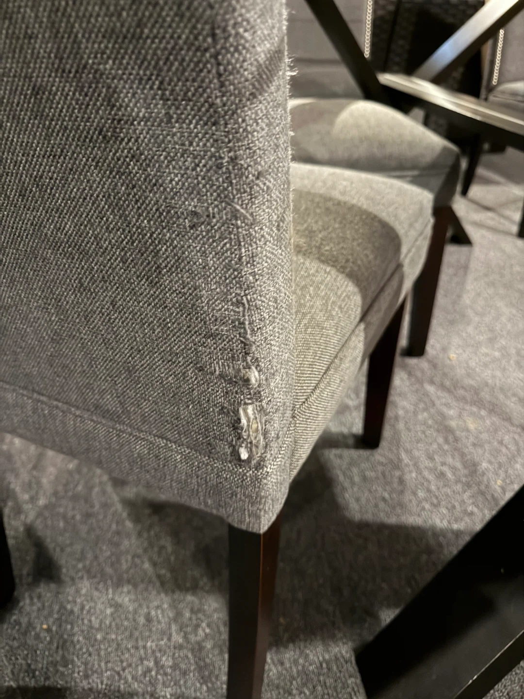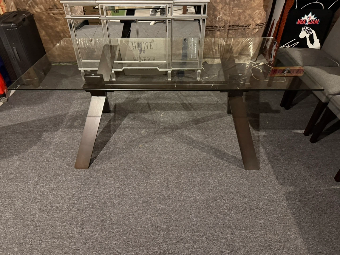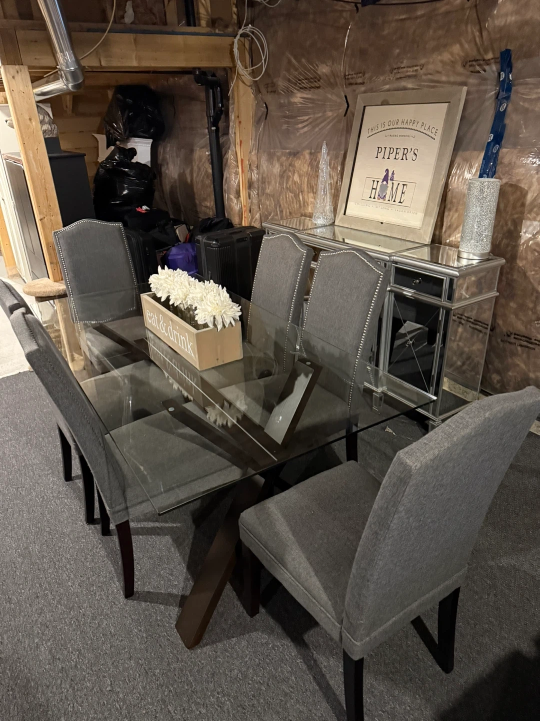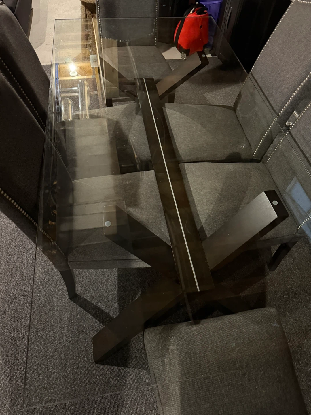 Selling a dining table with a glass top and six stylish grey chairs. It's in great condition and ready to be the centrepiece of your dining room. The chairs are comfortable and complement the table perfectly. A great set for family dinners or entertaining friends! There is some minor scratches on the glass table top (to be expected) and one chair has some damage to the rear (see photo) Minor Knicks on wood bench can be fixed with a brown sharpie. Dimensions 36” x 71” Height is 29” Non smoking home Pickup in North Pickering