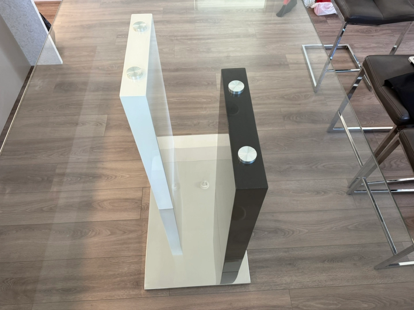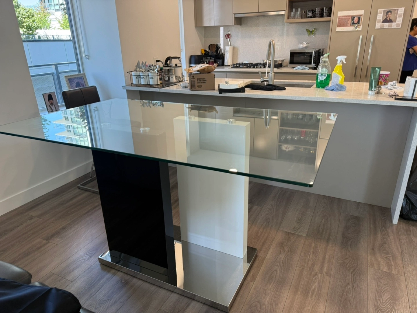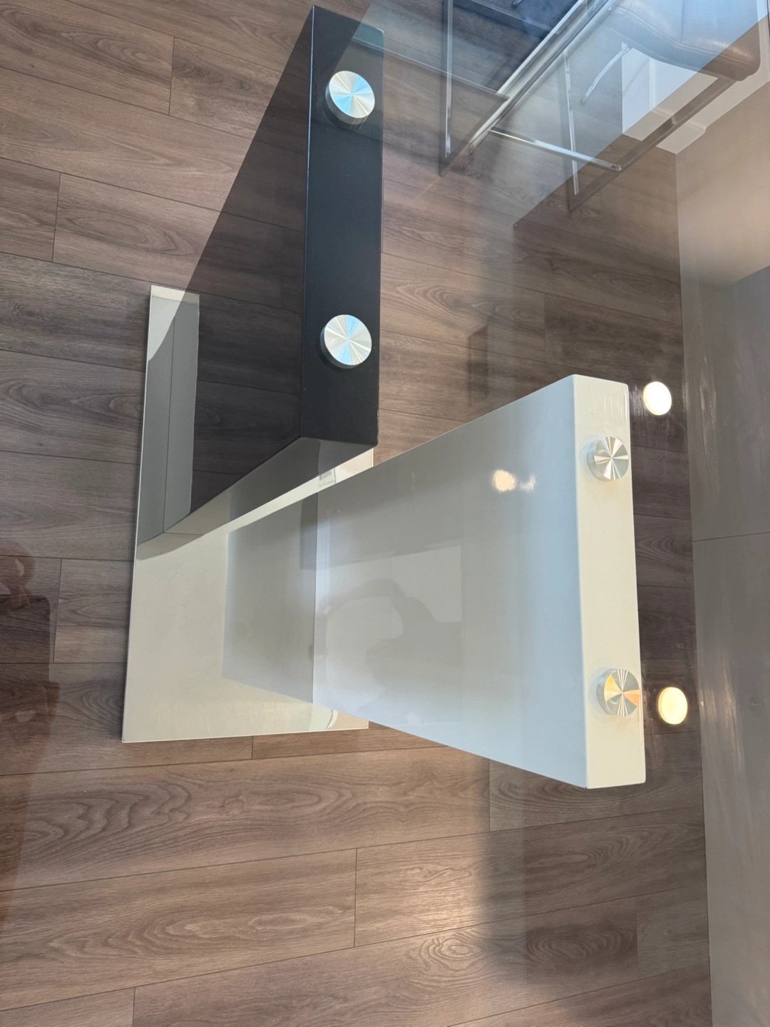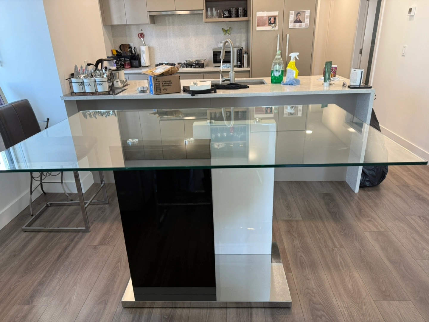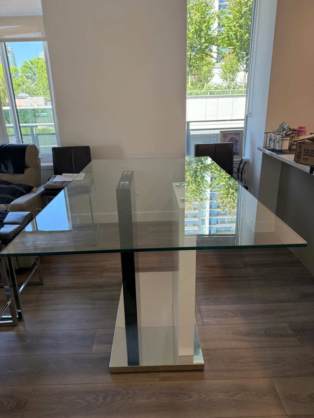 Selling a stylish dining table featuring a glass top and a modern base with black and white accents. It's a great addition to any dining space! $1500/OBO Comes with a cover as well.