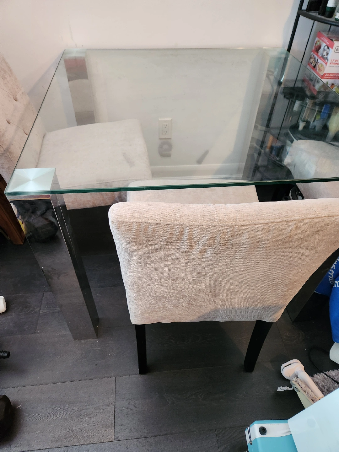 59Selling a dining table with a glass top and chairs. The chairs are a light beige colour and appear to be upholstered. The table legs look like they're made of a shiny metal, possibly chrome. It's in good condition and would be a great addition to any dining space!