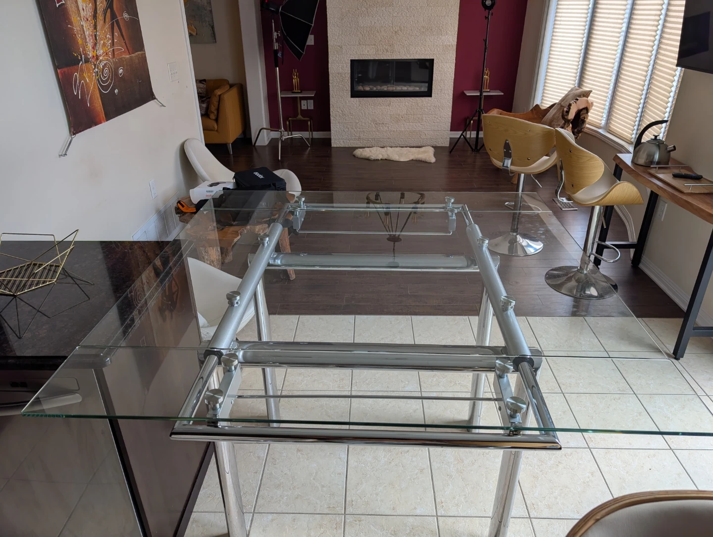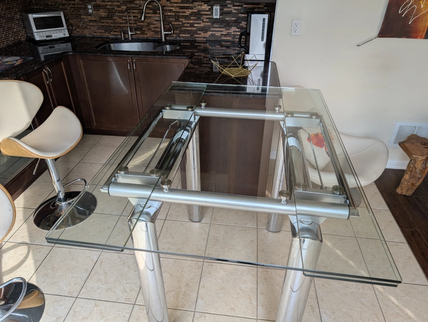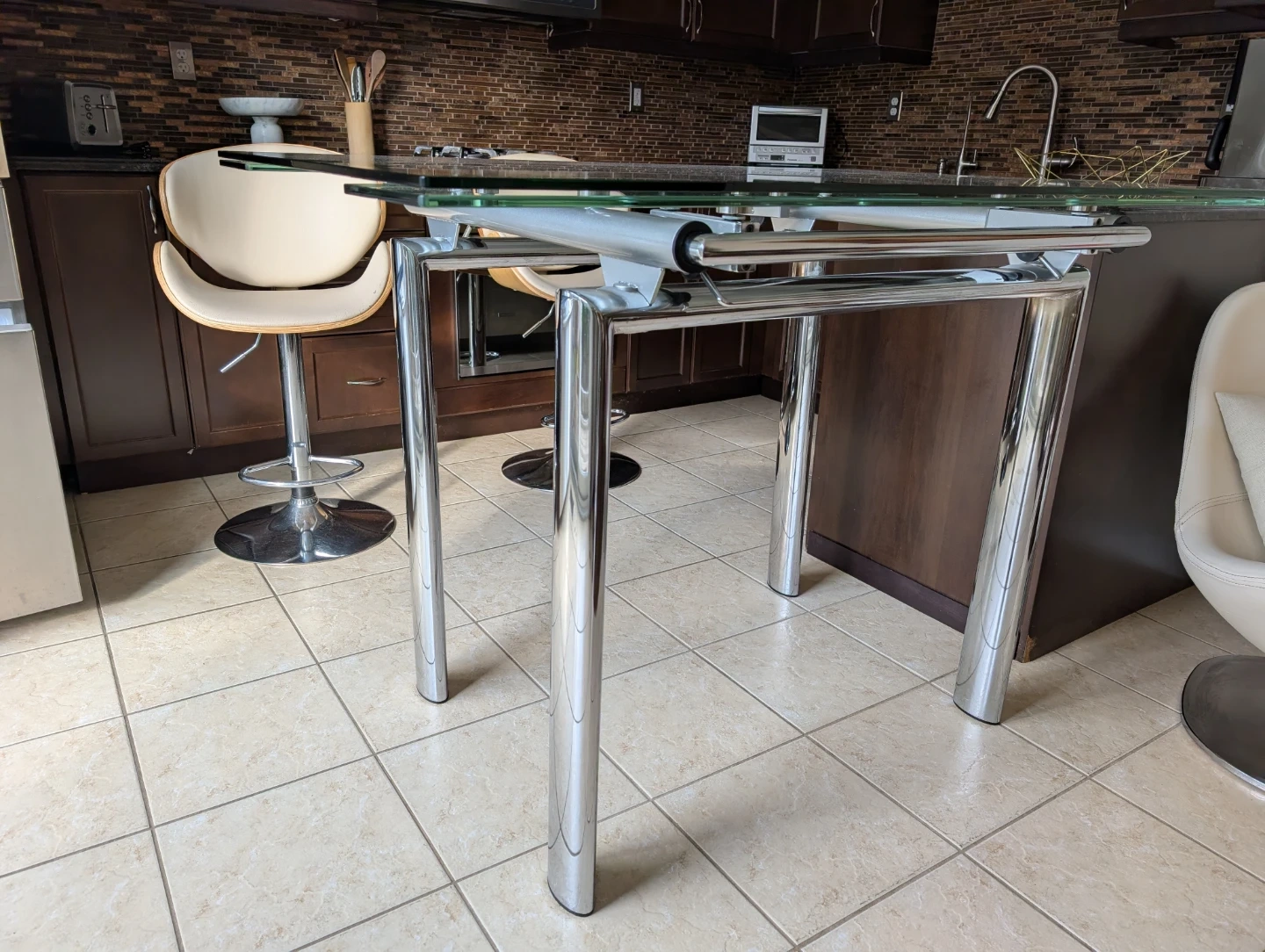 70Selling a dining table with a glass top and chrome legs. It's in great condition and would be a stylish addition to any dining space! The table features a sleek, modern design with a clear glass surface supported by sturdy chrome legs. The two side glass are retractable so you can have a small it a big table in second L78 H41 Small width 32 Big width 54
