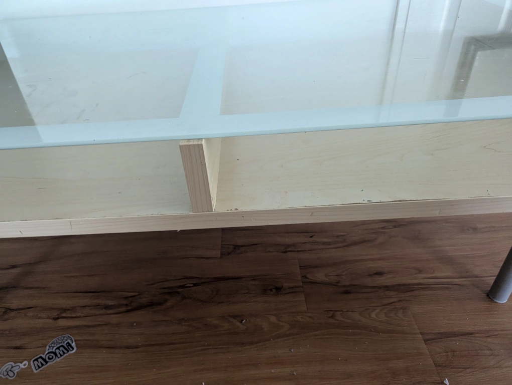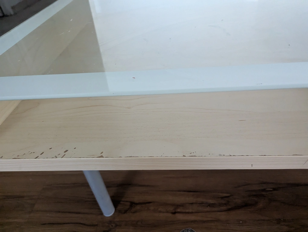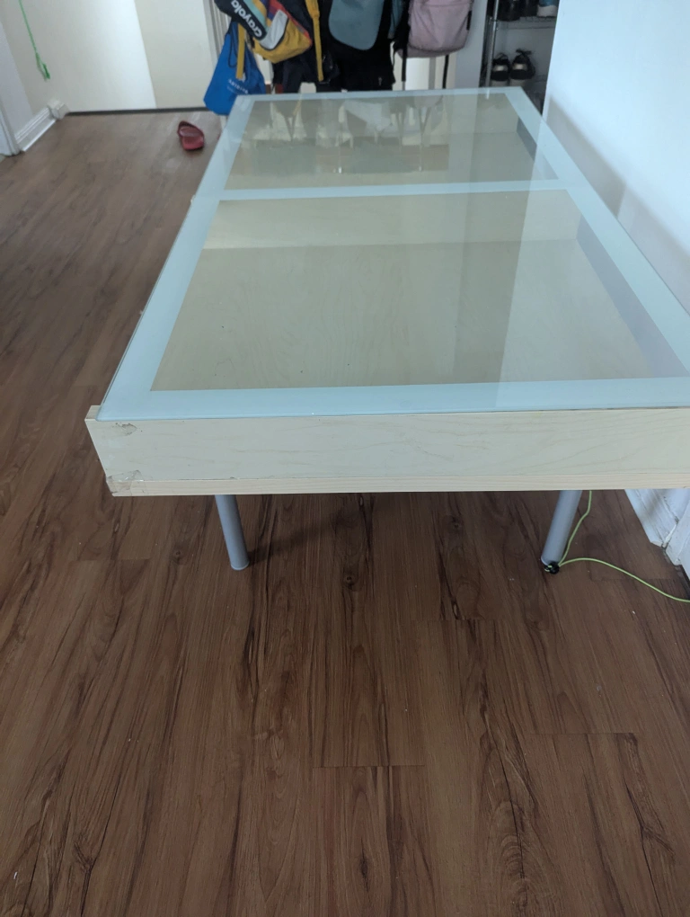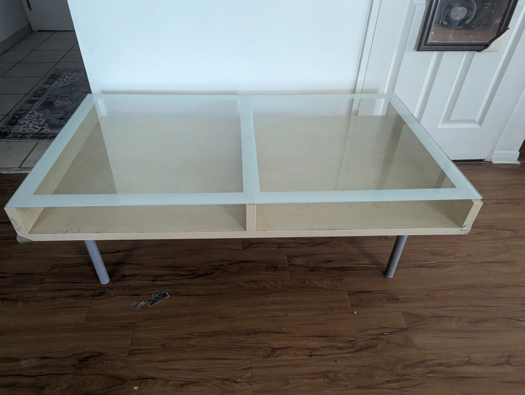 Selling a coffee table with a glass top and a light wood frame. It has a modern look. There are a few minor scratches on the wooden frame, but the glass top is in good condition. Perfect for a living room or den!