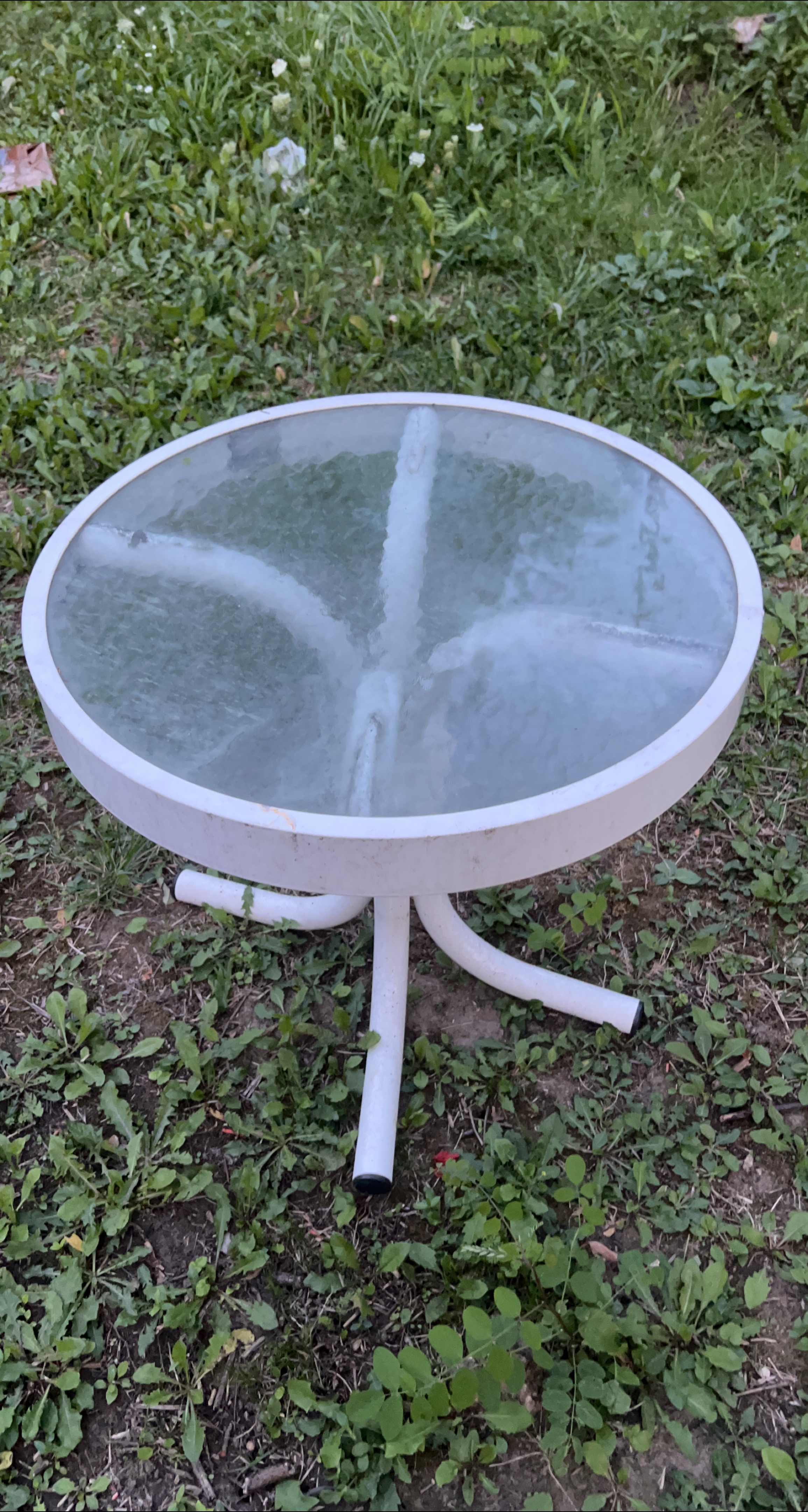 Selling a glass top outdoor table with a white metal frame. It's in good condition and perfect for a small patio or balcony. It has a round shape and a sturdy base. Great for enjoying a coffee or snack outdoors! Two available
