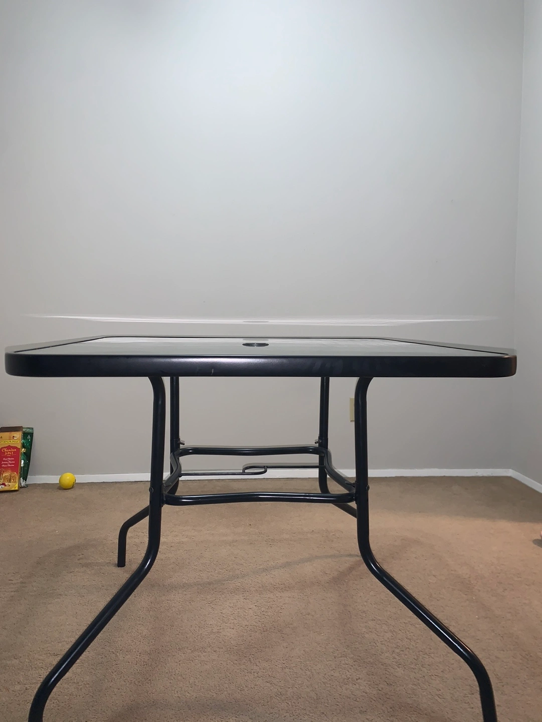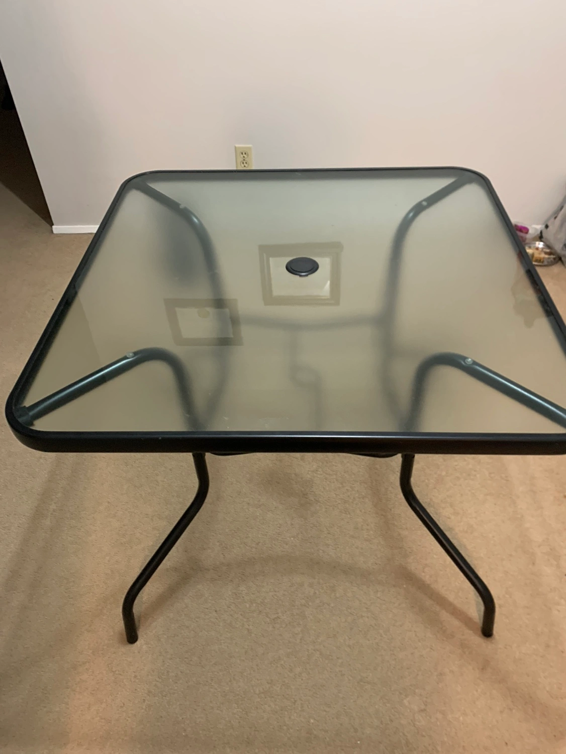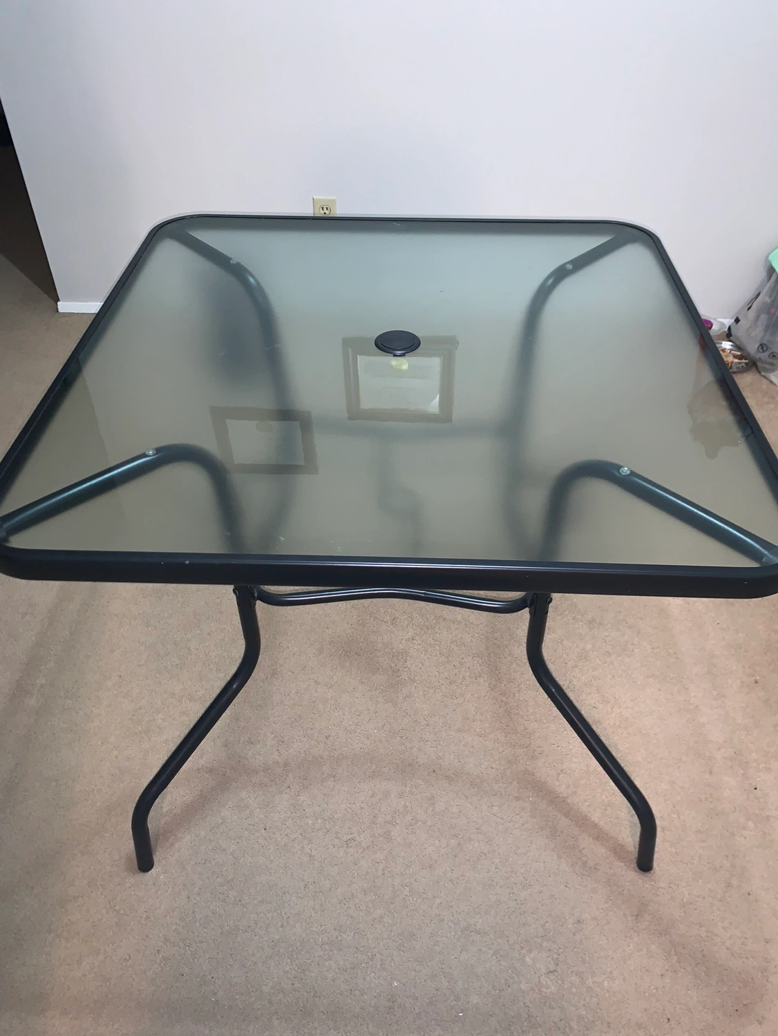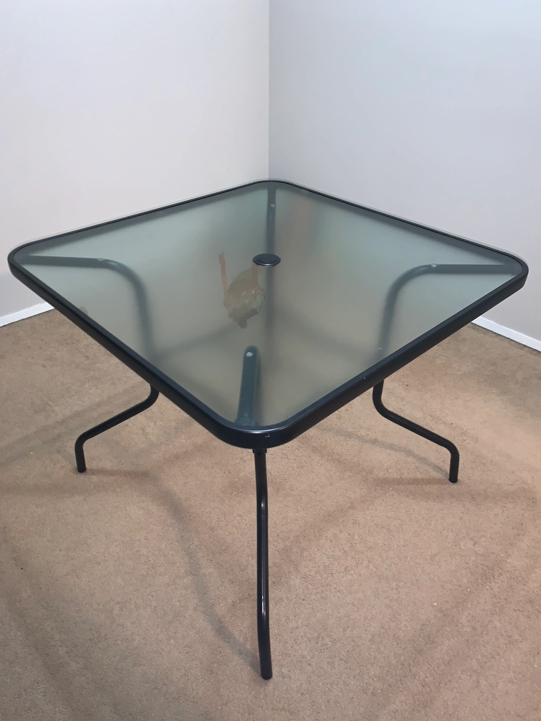 26Black metal frame with a square glass table top. The glass is frosted. There is an umbrella hole in the centre of the table. The table is approximately 30 inches high by 38 inches wide. Never used patio table.