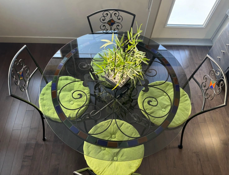 62Selling a glass top round dining table with four chairs. The chairs have a decorative metal back and green cushions. The table has a dark trim with colourful tile accents.