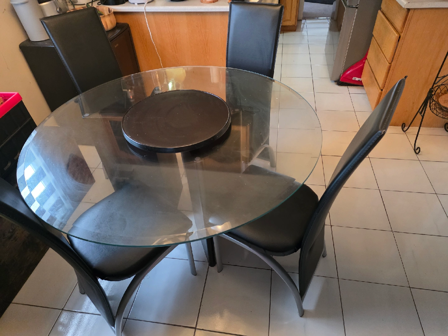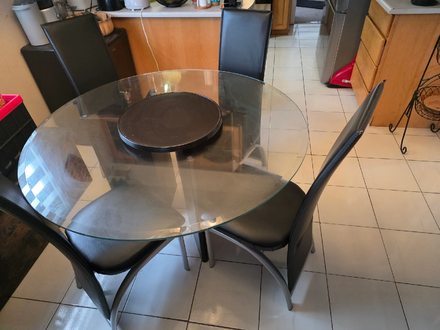 10Selling a round dining table with a glass top and four chairs. The chairs are black with a curved metal base. The table has a lazy susan in the middle. It's in good condition and ready for a new home!