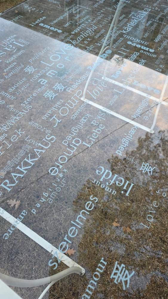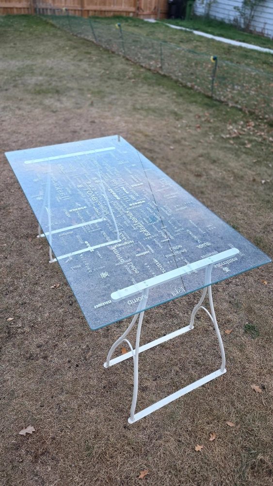 93Selling a glass top table with white metal legs. The glass has various words printed on it in different languages. Very good condition. It's a unique piece that could add some character to your space! Dimensions 150*80*72 cm (59*31.5*28.5 in). Pick up at Delton. Also I can deliver. _____ SEE ALL MY ADS