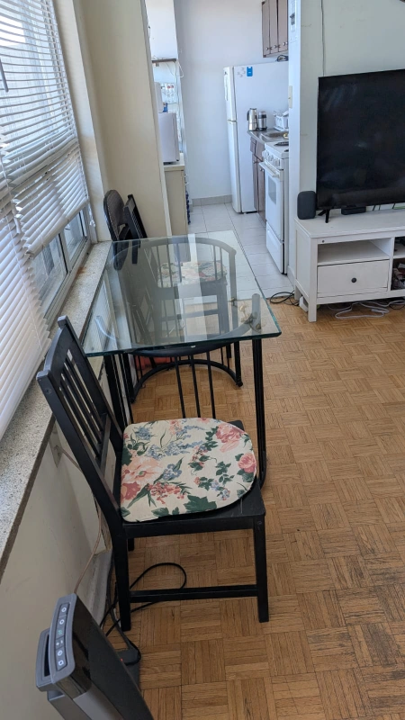 1. Glass top dining table in good condition and glass is 2cm thick and very solid. Dimensions: 4ft x 2ft x 2cm. Table: $40 Wooden chairs: $15 each 2. Glass top circular balcony (3ft x 3ft) table and 4 high chairs. Table: $60, Chairs: $25 each 3. Glass study desk with 4 adjustable legs in great condition. Can be adj between 23cm and 35cm high. 46.5 inch wide Aluminum trim around the edge. $100 I am having a moving out sale. Everything must go by Oct 29! Message me if interested, serious buyers plz π I am trying my best to keep prices low and reasonable π