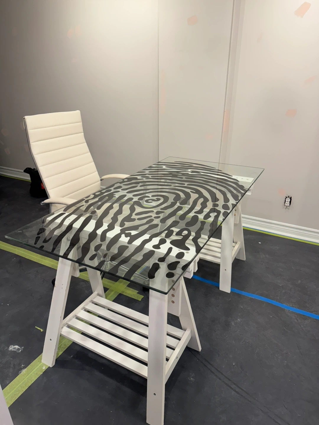65Selling a glass table with cream-coloured leather office chair. It's in good condition and would be perfect for a home office or study space. The chair has a high back and armrests for added comfort.