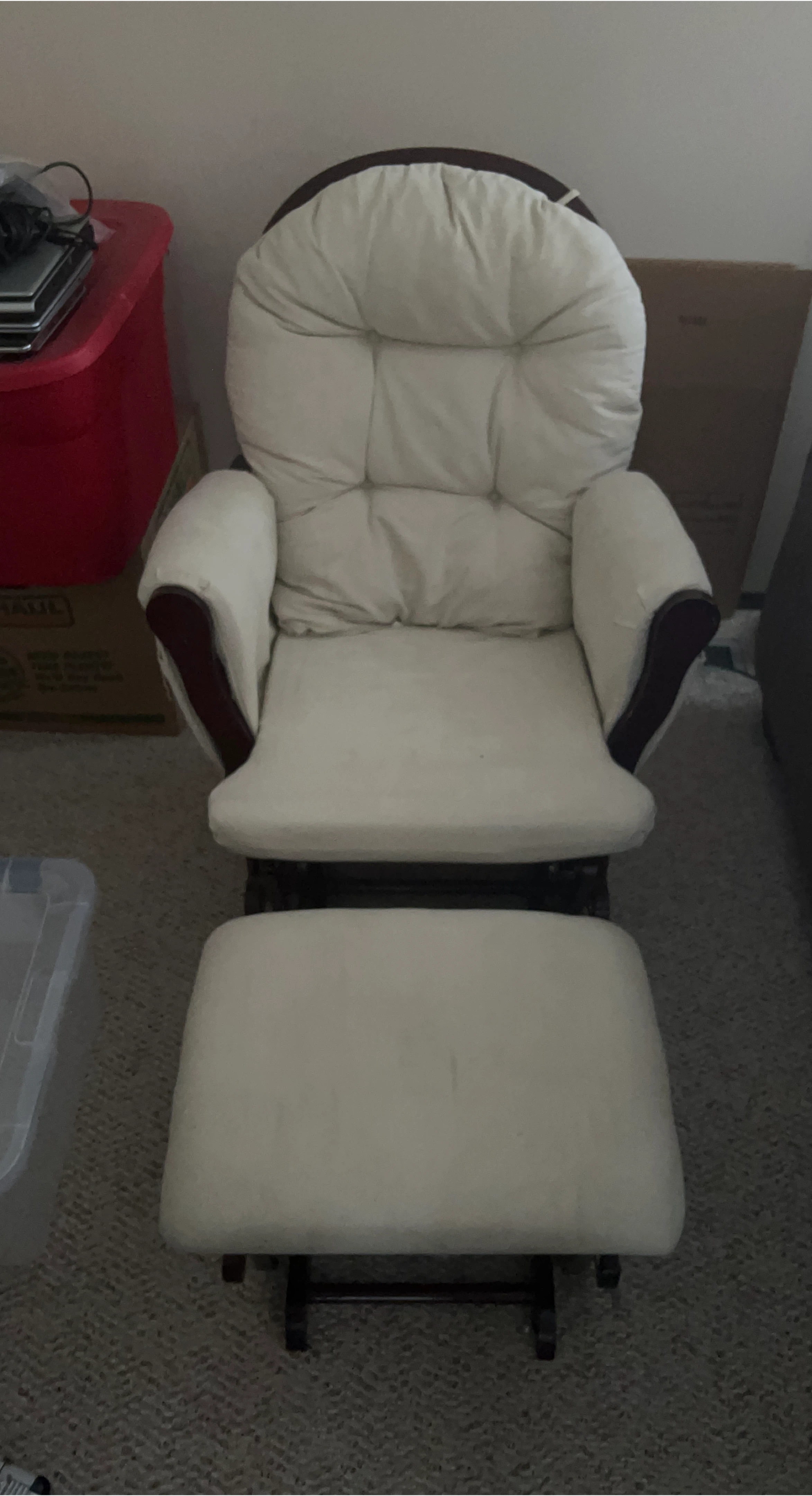 28Selling a comfy glider rocking chair with a matching ottoman! It's perfect for relaxing and would be great in a nursery. It has a cream-colored cushion and dark wood accents. There are some signs of use on the cushion, but it's still in good condition and ready for a new home